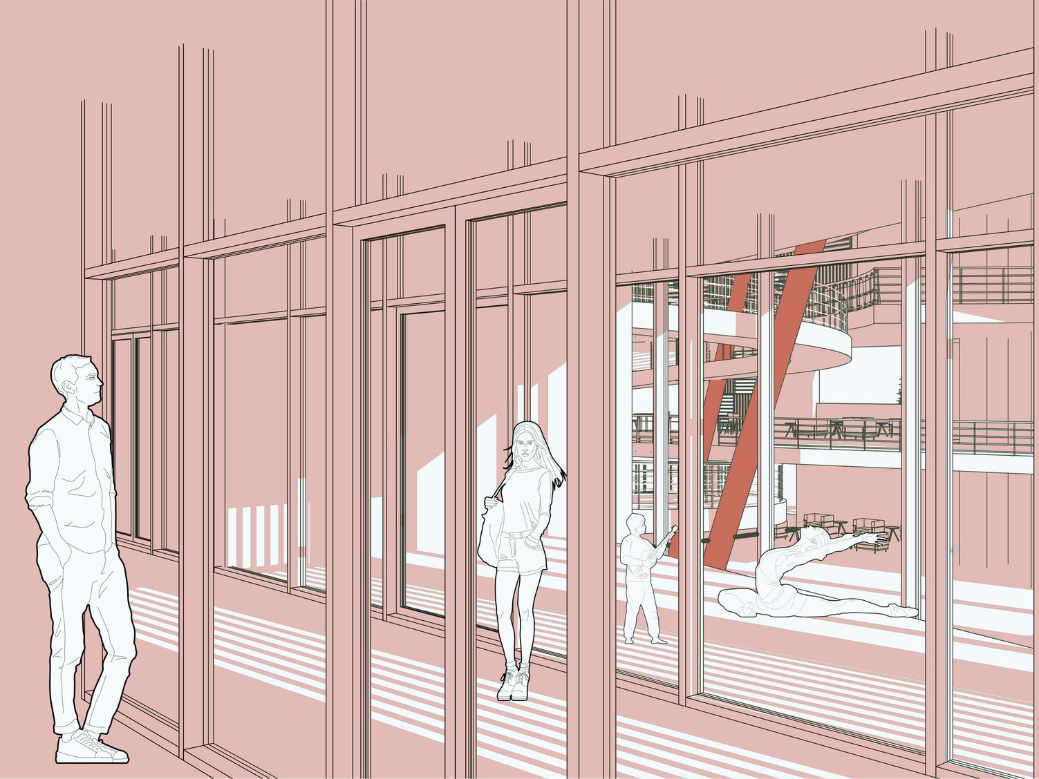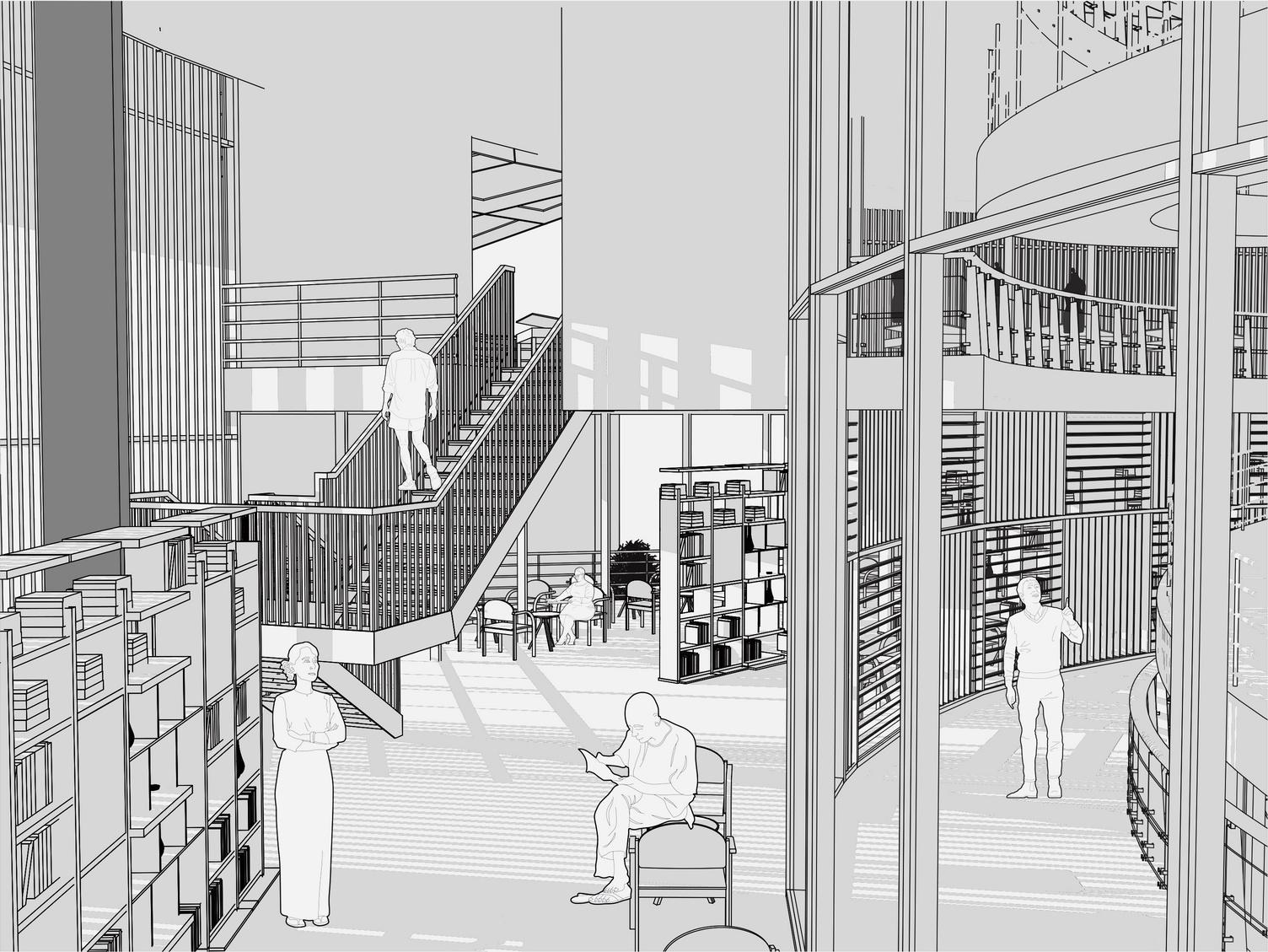 The link bridge is located here because the City Square Mall doesn't have a library, so I thought it would be nice to provide a connection to my building, allowing users who want to access the library to easily come over and use it.
