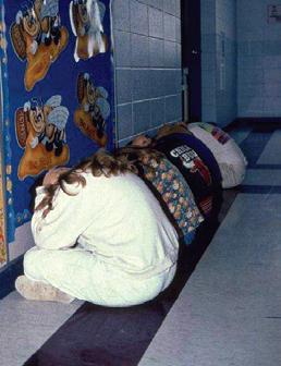 ■ Ensure students and staff know the protective position (shown below). Everyone should sit facing an interior wall, elbows to knees, and with hands over the back of their heads.