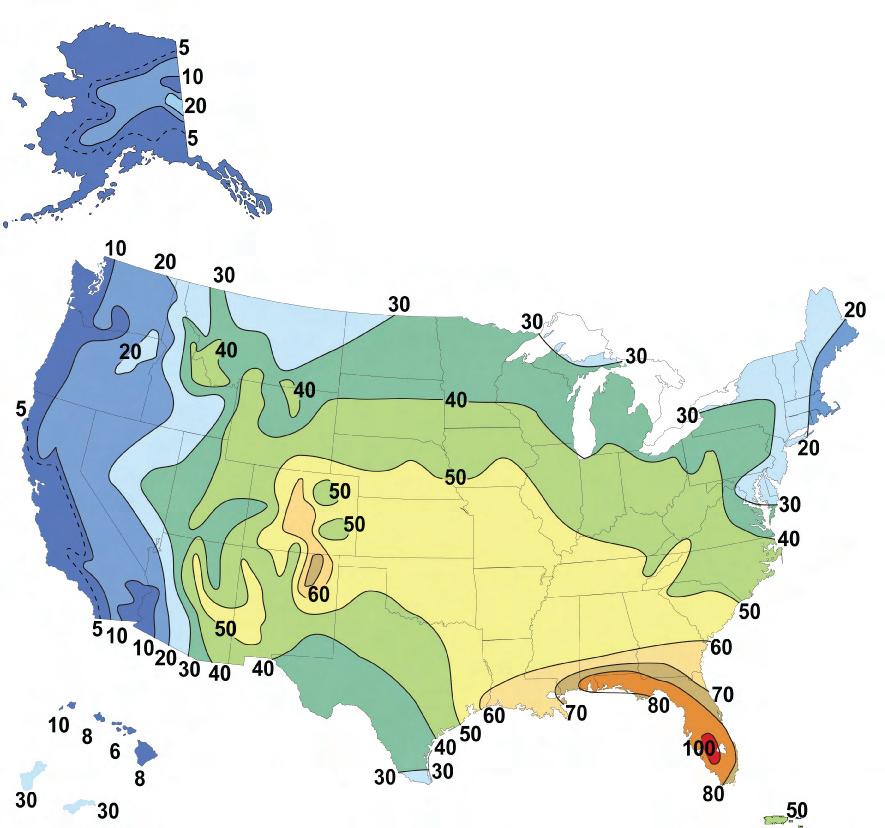 ■ Most likely time for hail, heavy rain, frequent lightning, strong winds, and tornadoes
