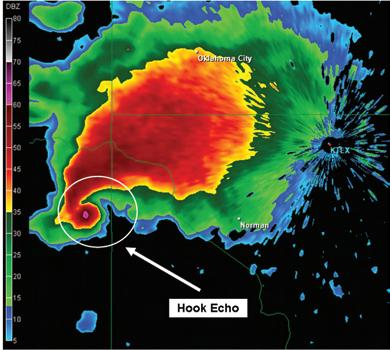 TThe NWS has a Doppler radar network strategically located across the country that can detect air movement toward or away from the radar. Early detection of increasing rotation aloft within a thunderstorm can allow lifesaving warnings to be issued before the tornado forms. In Figure 1 Weather Service Doppler radar detected strong rotation within the storm where red colors (winds moving away from the radar) and green (winds blowing toward the radar) are close together. Figure 2 reveals the “hook echo” that appreared in the radar’s reflectivity data. Figure 3 shows a violent tornado in northern Oklahoma at the same time the radar image was taken.