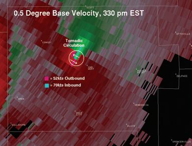 An area of rotation, 2-6 miles wide, now extends through much of the storm. Most tornadoes form within this area of strong rotation.