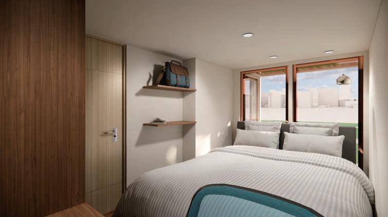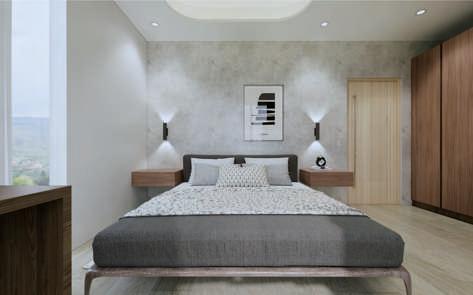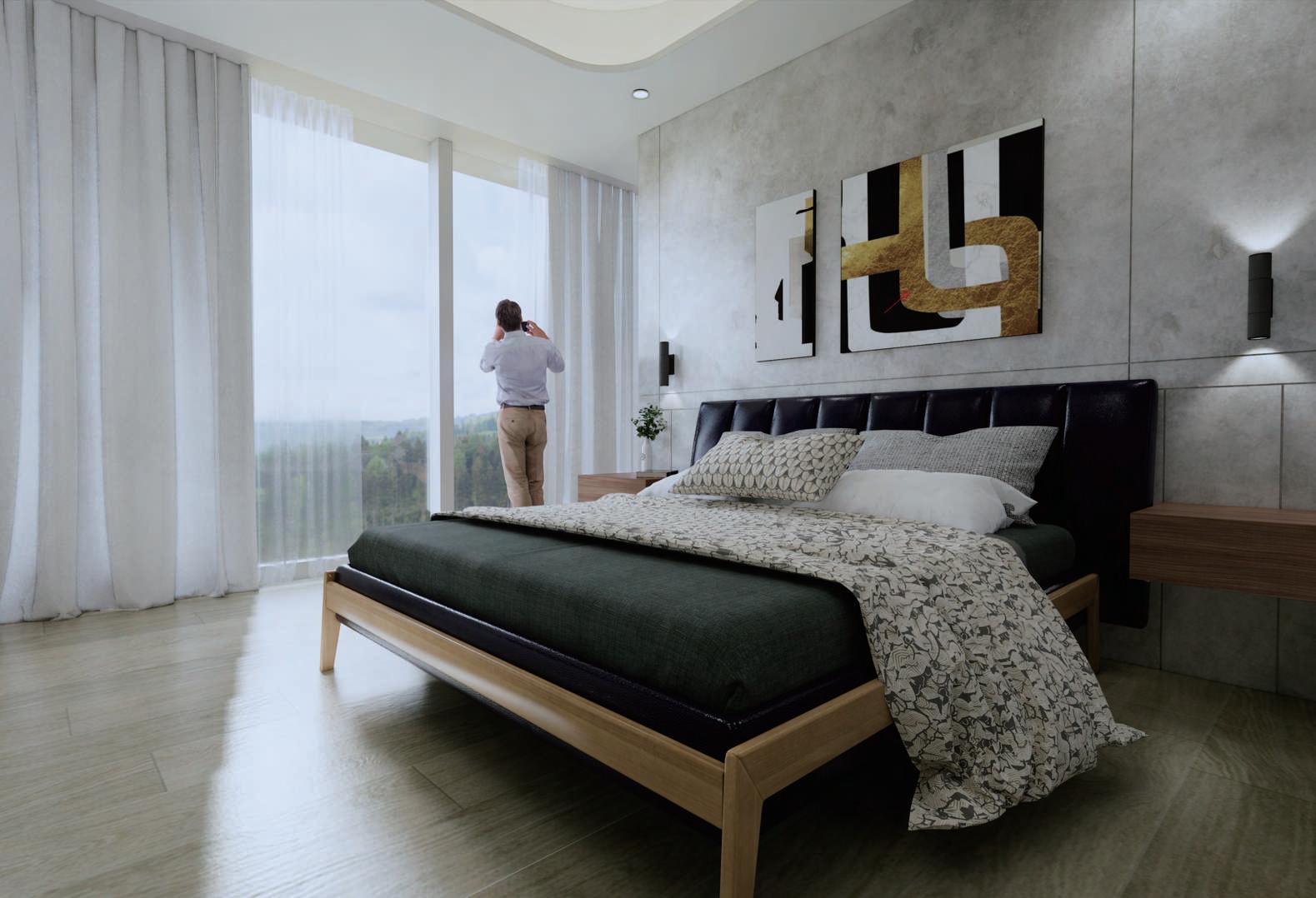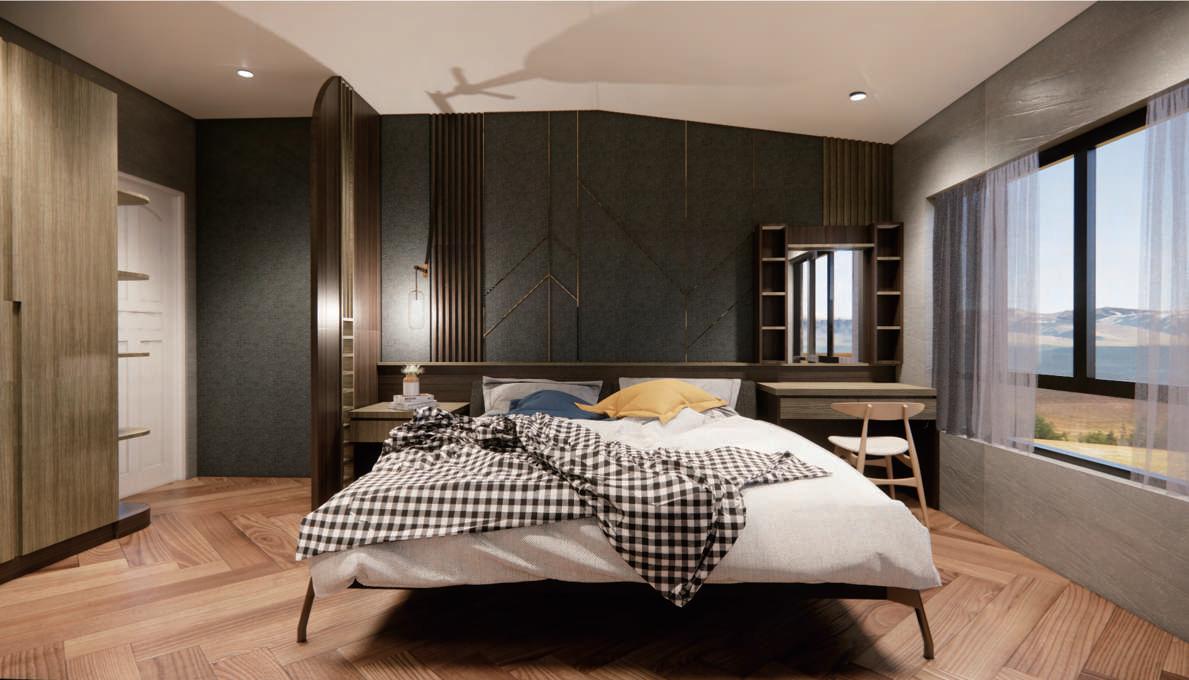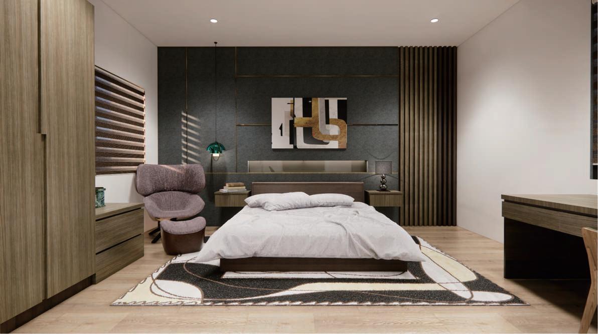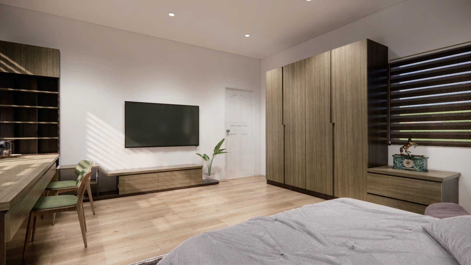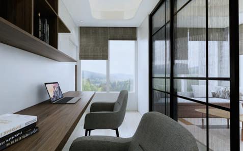 主臥套房配置於辦公空間後側 ,以衣物收納櫃體、電視牆、 裝飾層板作為配置。