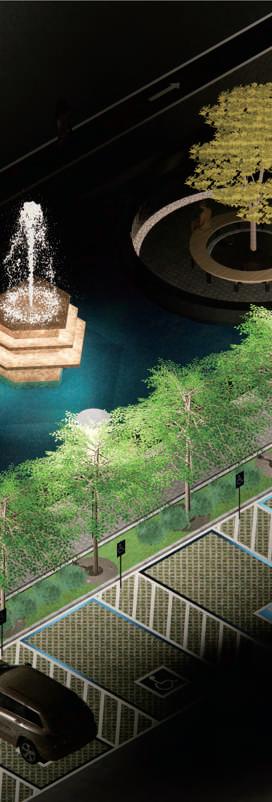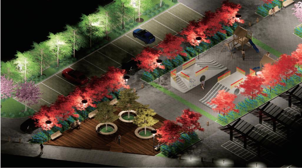 從渲染模擬途中可看見燈光設置在人們主要聚集的地方,在適切的照明地點提供夜間使用者的空間指引,不同用途、類型的燈具 造就棒球場社區的氛圍。