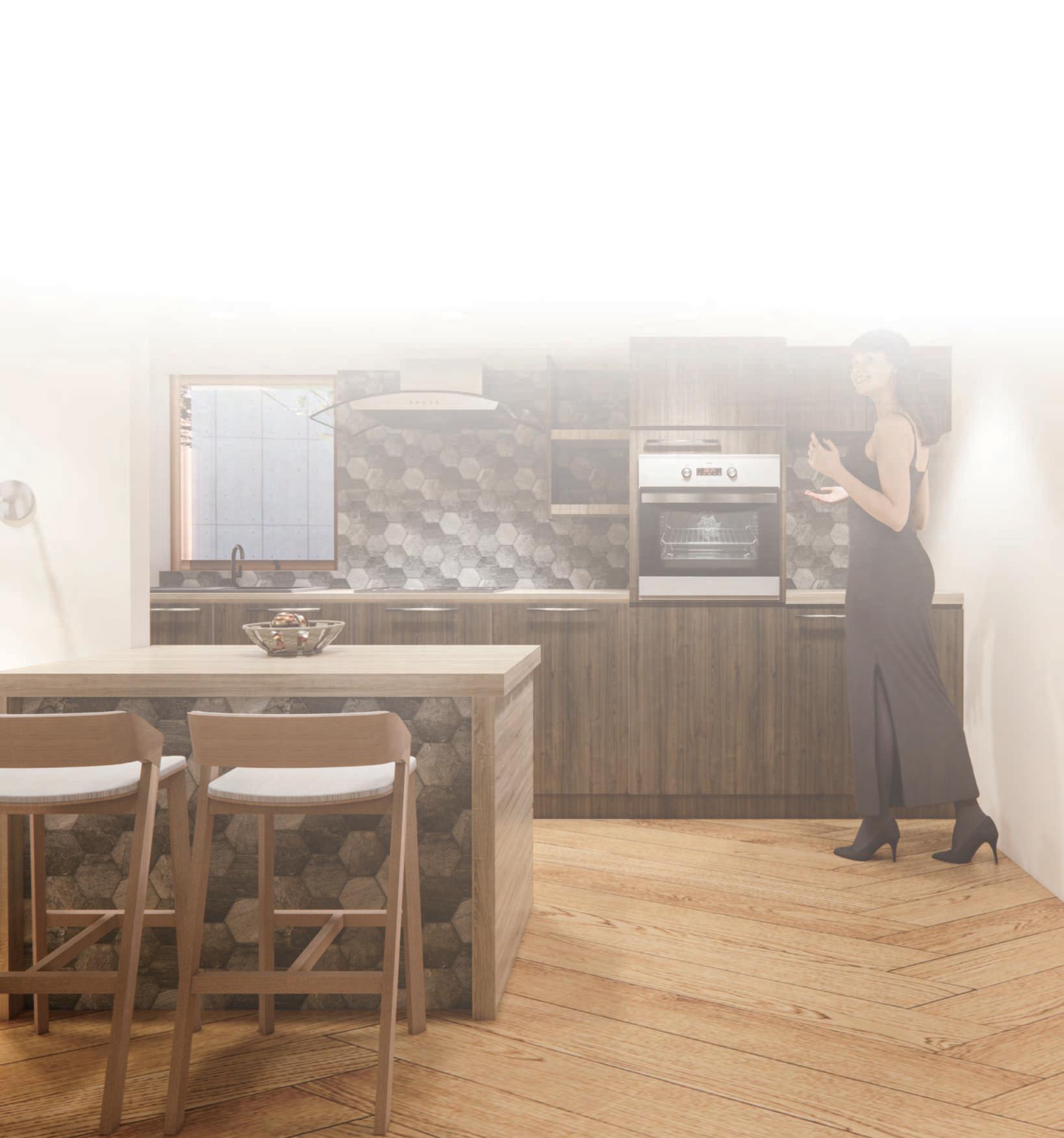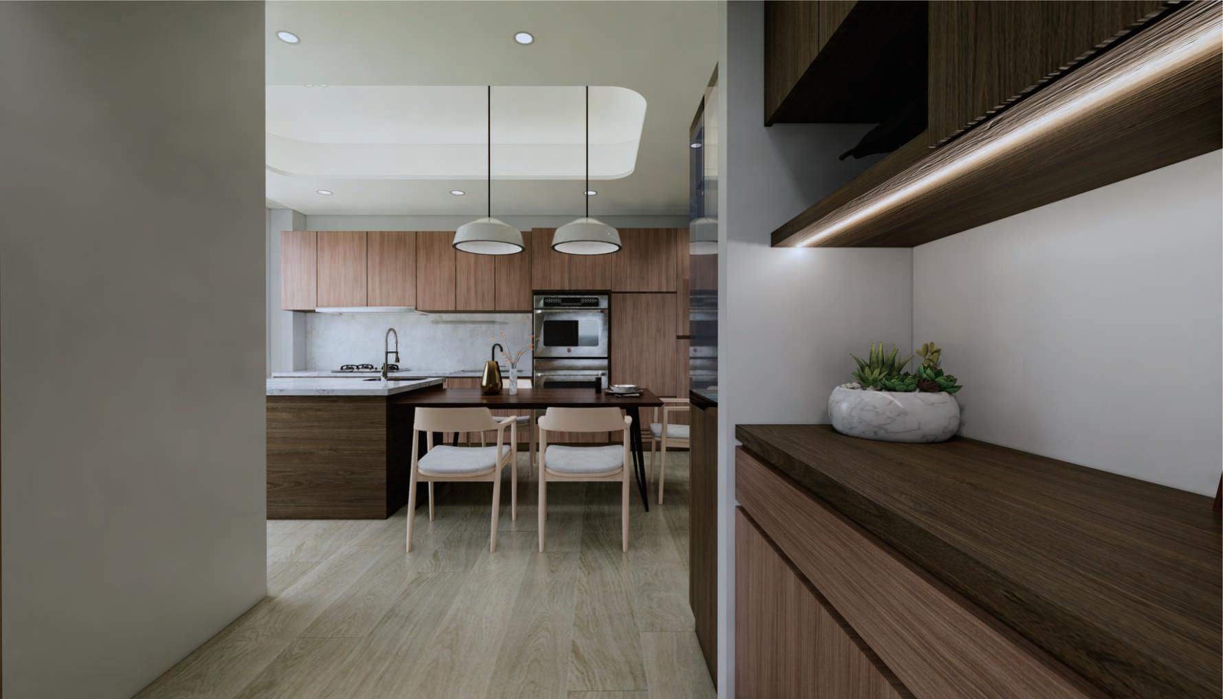 廚房中島與餐廳結合做為半開 放式,增加視覺通透及採光, 使空間更加寬敞。