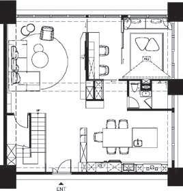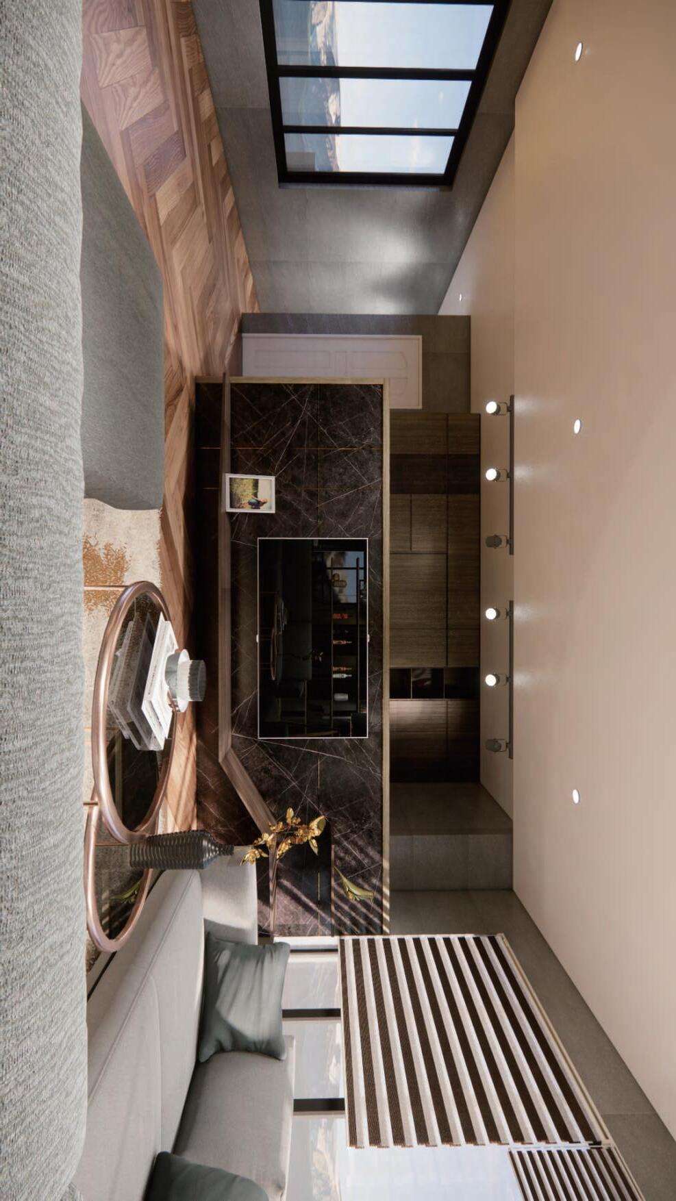 入口動線以左側綠帶 門廊作為進出移動區 域,以對應詩句開頭 ,可有效利用室內空 間,進門即是落地窗 端景,客廳及廚房則 以電視牆作為區隔。
