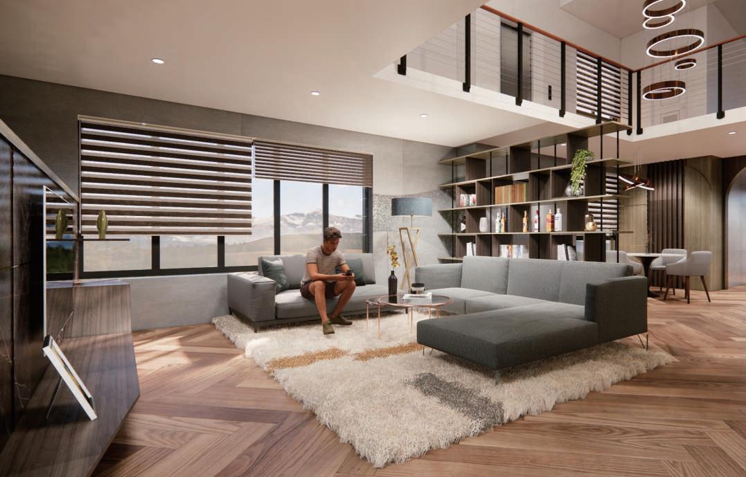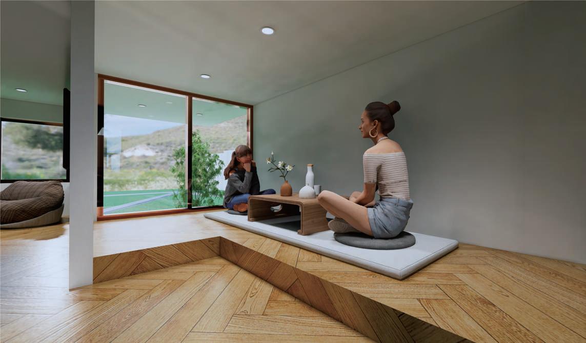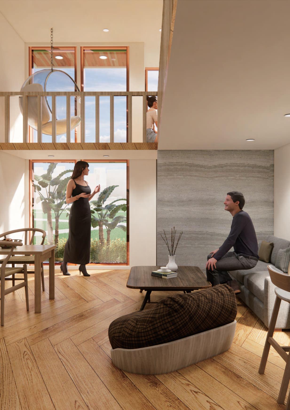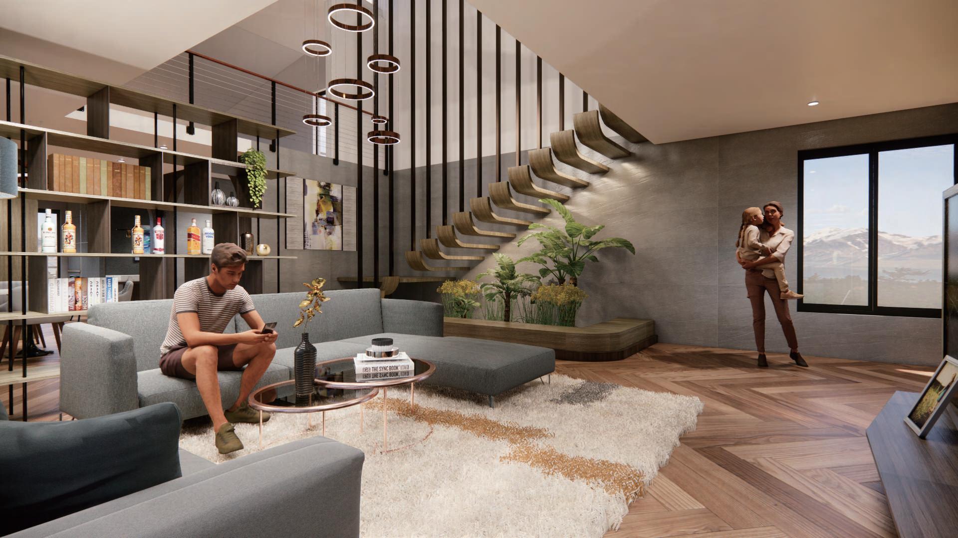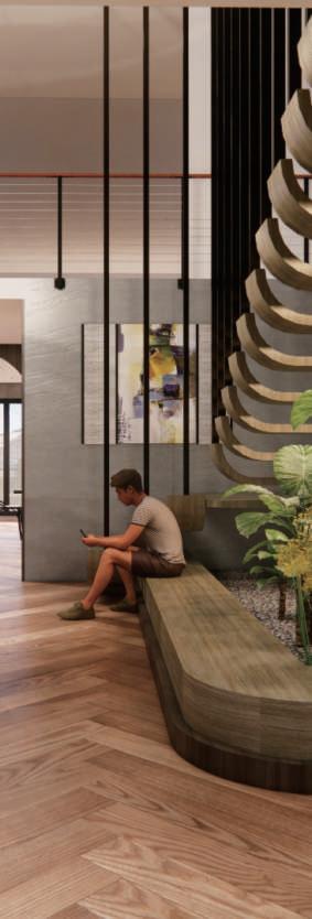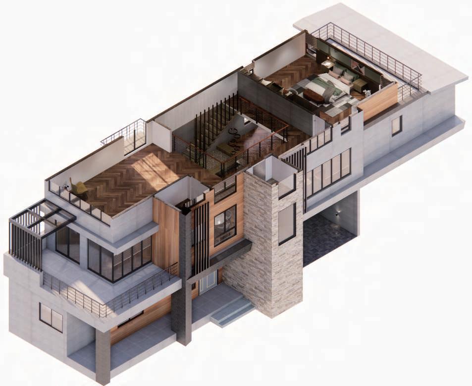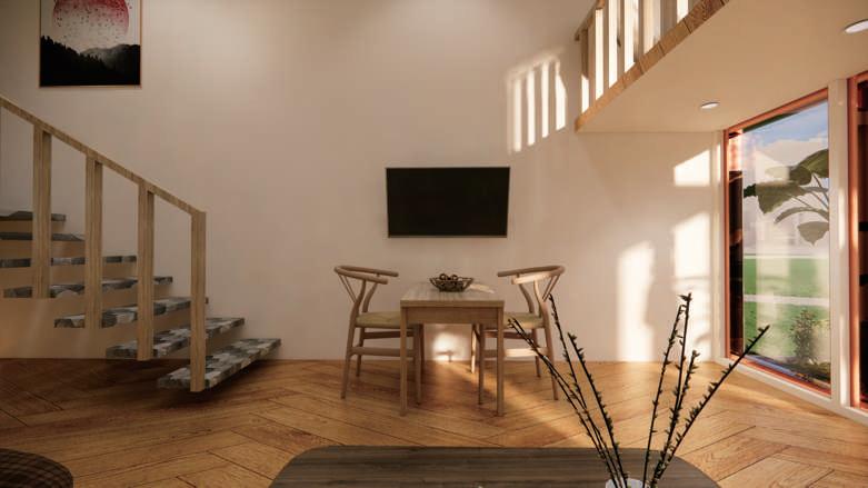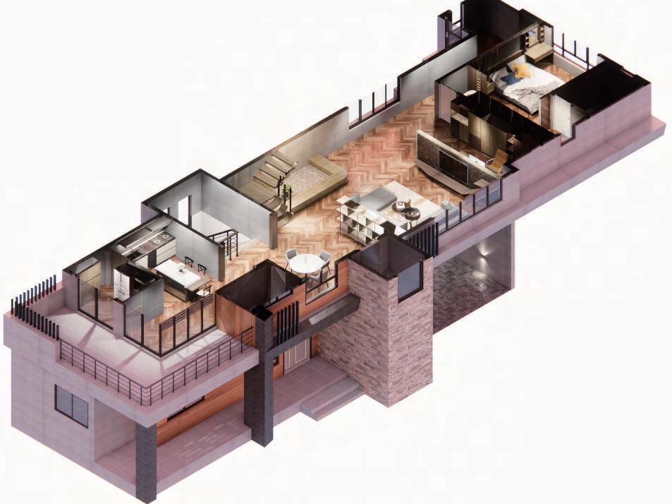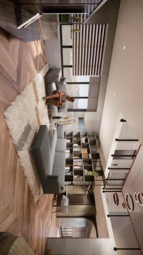 採用大地色及木木紋做為材質基底 ,並以亮眼的色系及材質作為點綴 ,其中包含人字拼木紋、金屬材質 落地窗框、石板紋路階梯,提升空 間的活潑、動態感。
