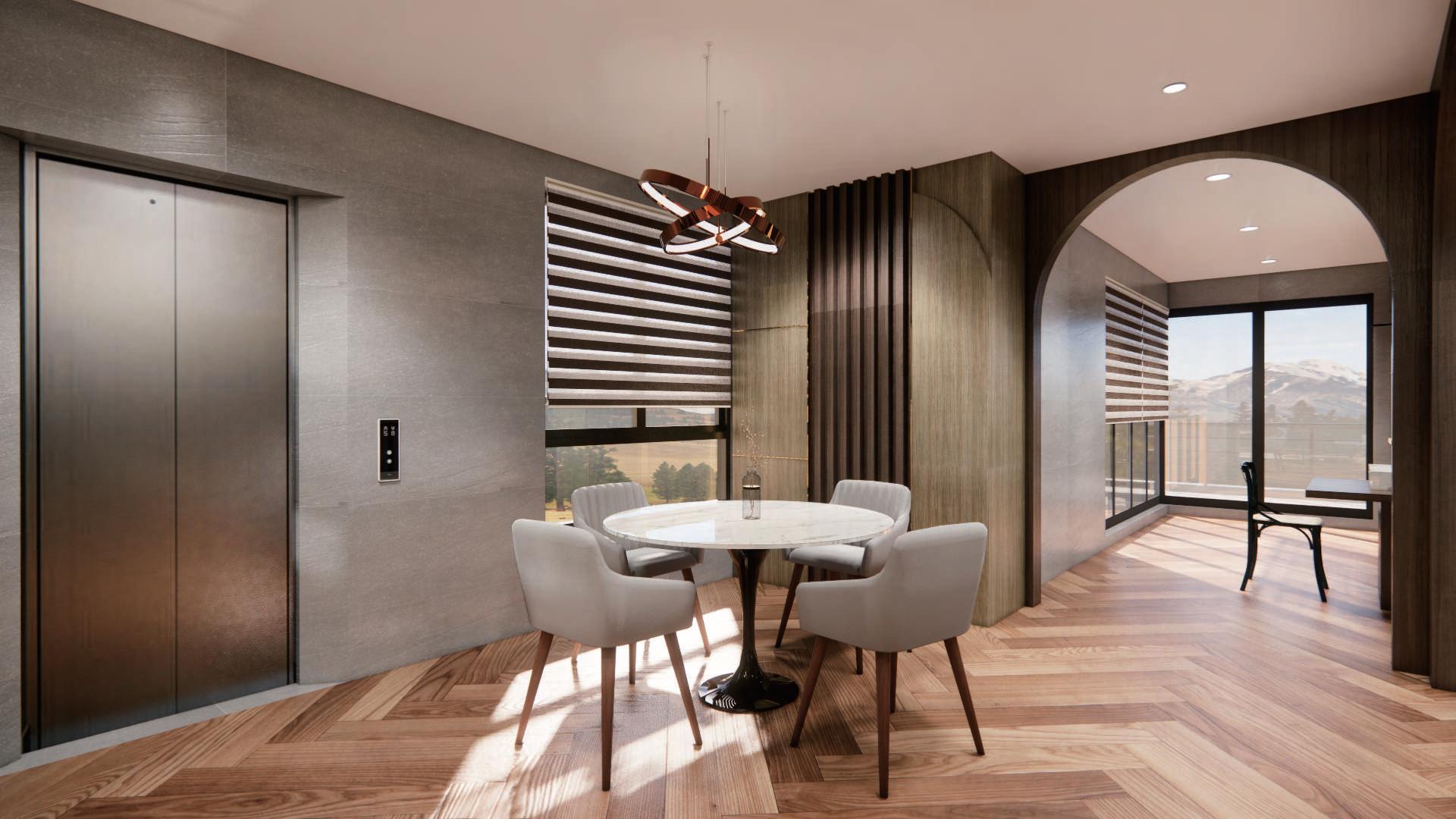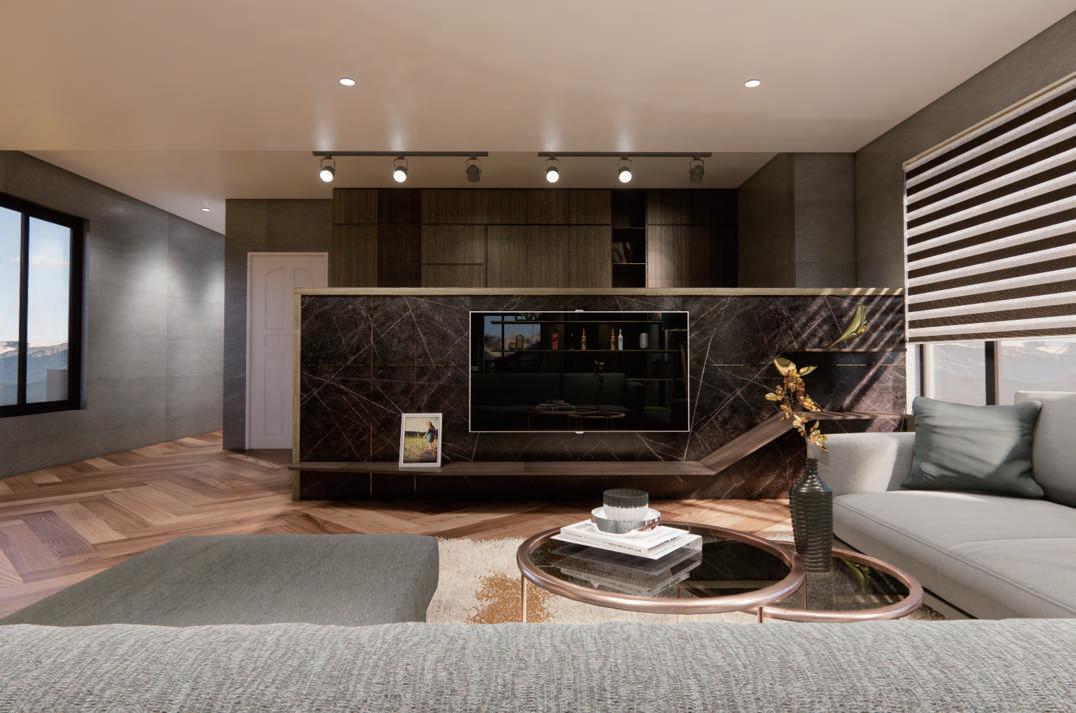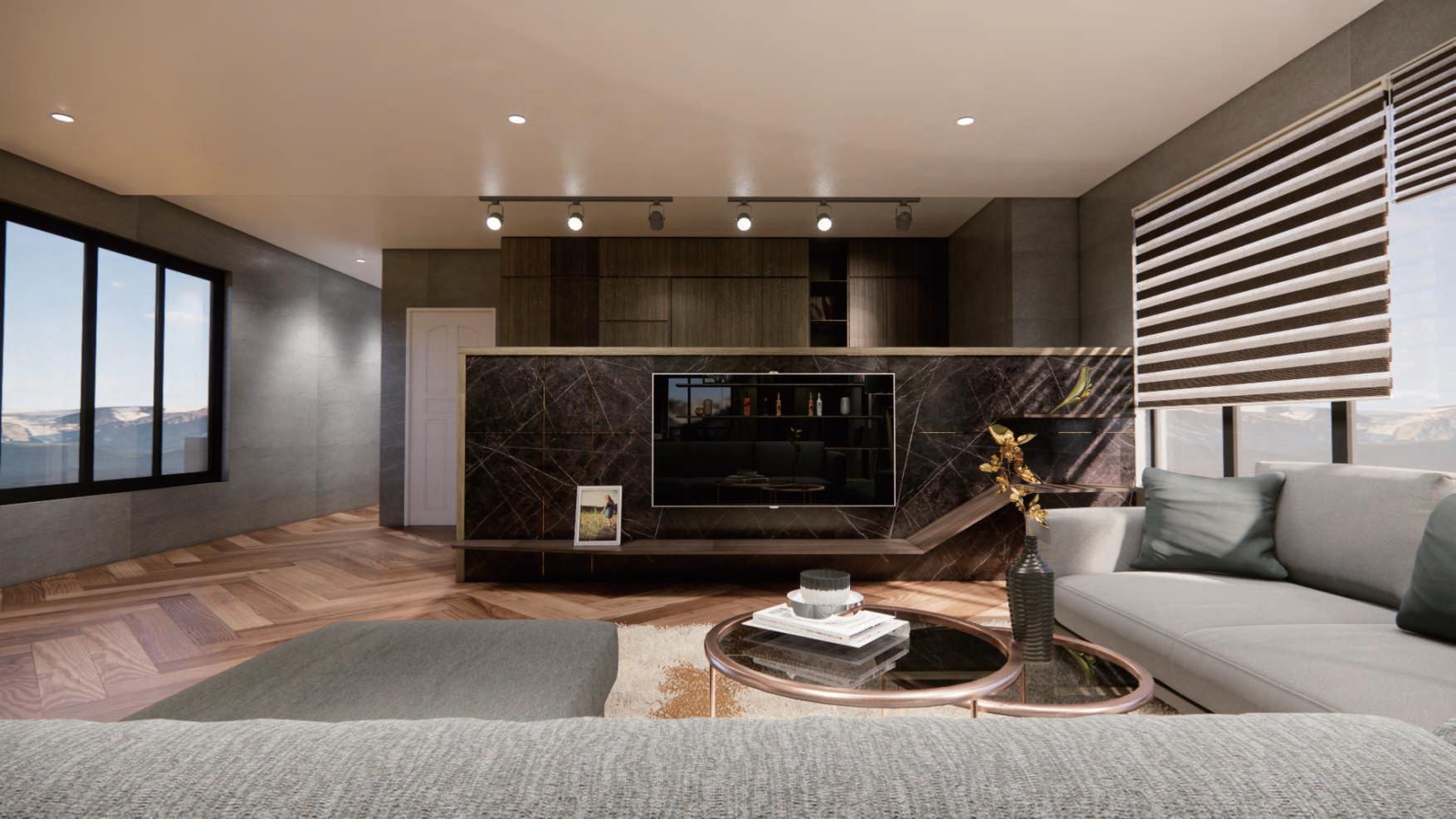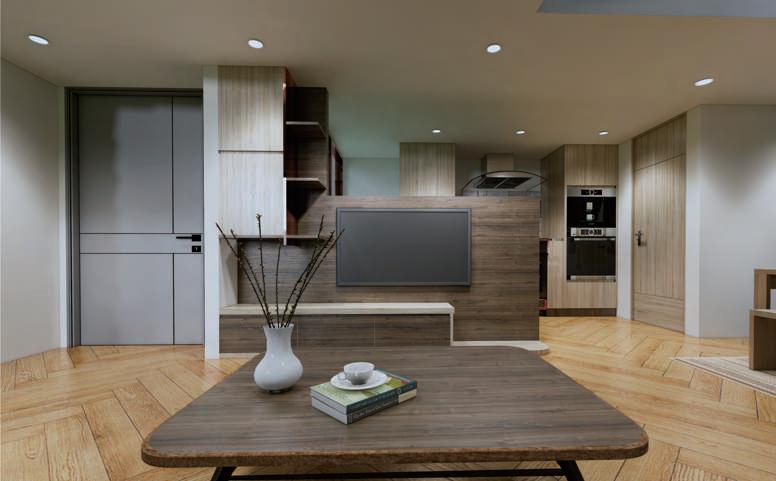 採用美耐板及石材作為配色,風化柚木、摩卡 冷杉、石墨石紋、卡拉卡塔石紋等建材