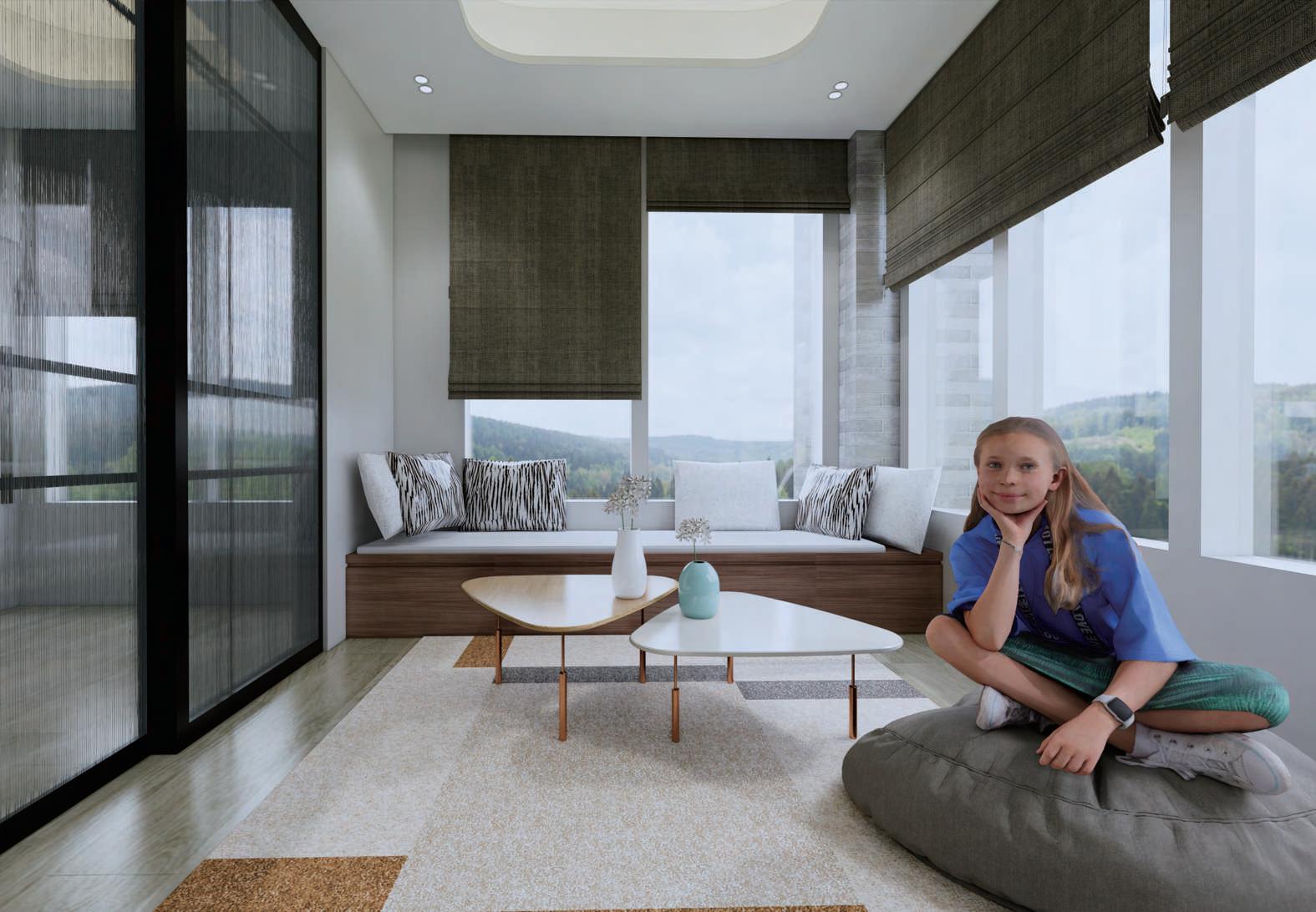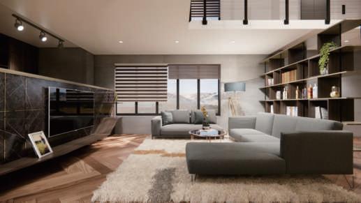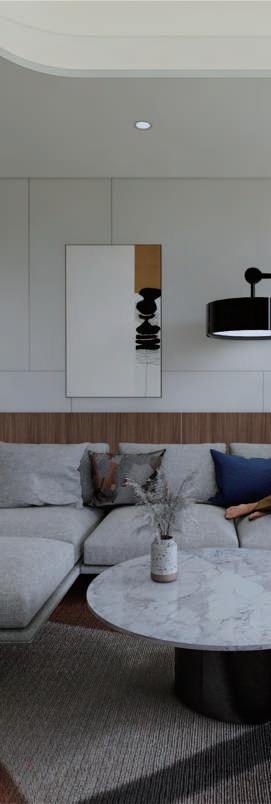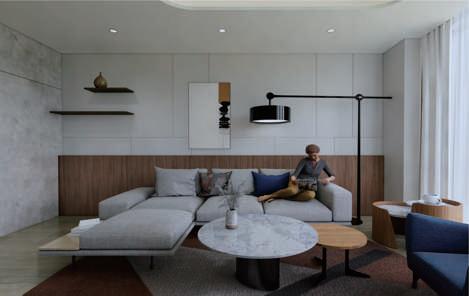 大面積的灰與白作為室內基底,搭 配具溫暖調性柚木與淺色木地板, 並以深色胡桃木作為襯托營造沉穩 平靜的氛圍,讓居住者達到身心放 鬆,再以小面積的普魯士藍做為空 間的點綴物,增添熱鬧活潑感。