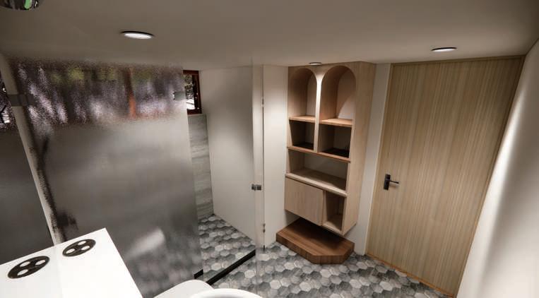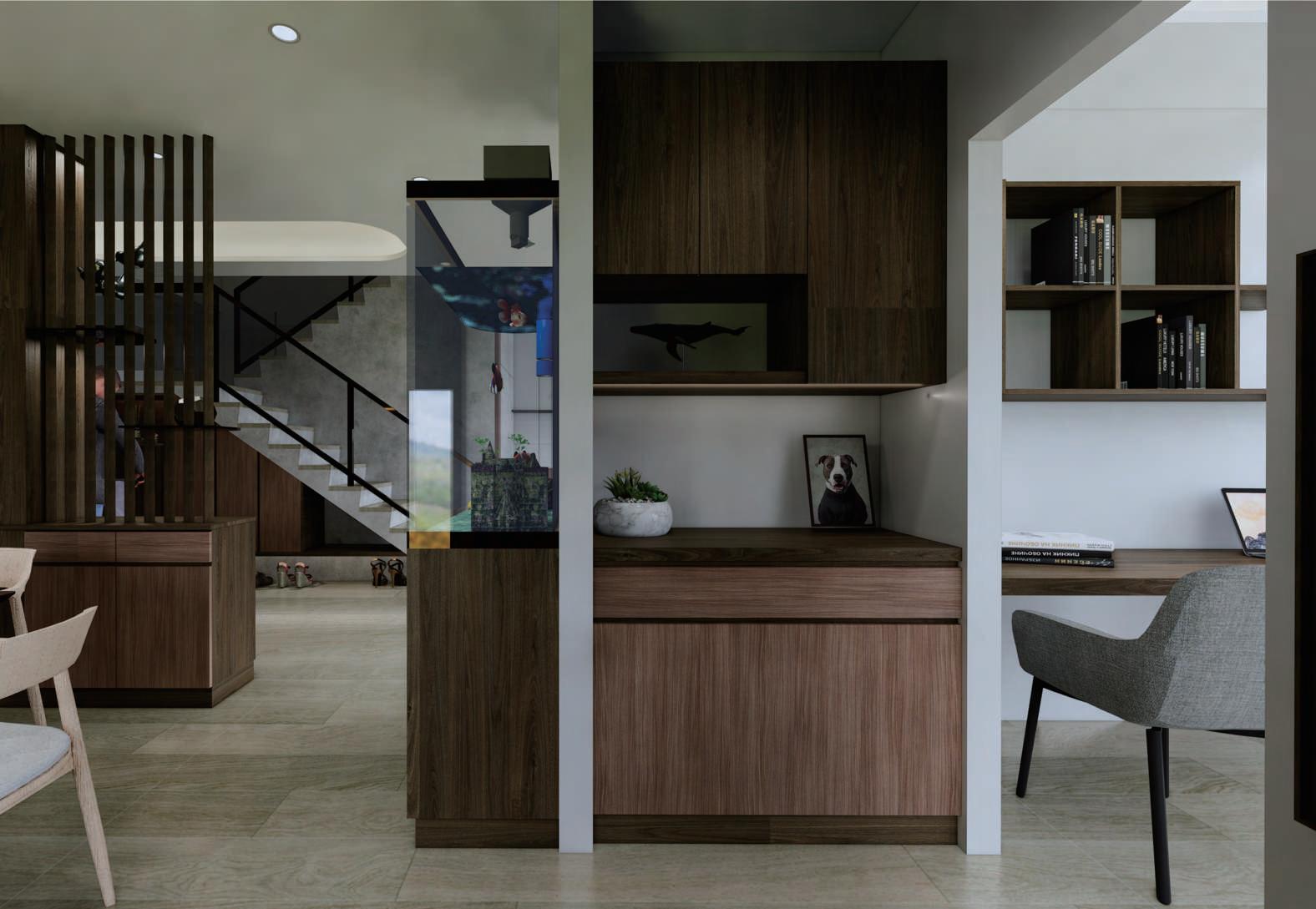 餐廳通往書房之走道以櫃體作 為收納區域,提升收納空間, 可存放常用之生活備品。