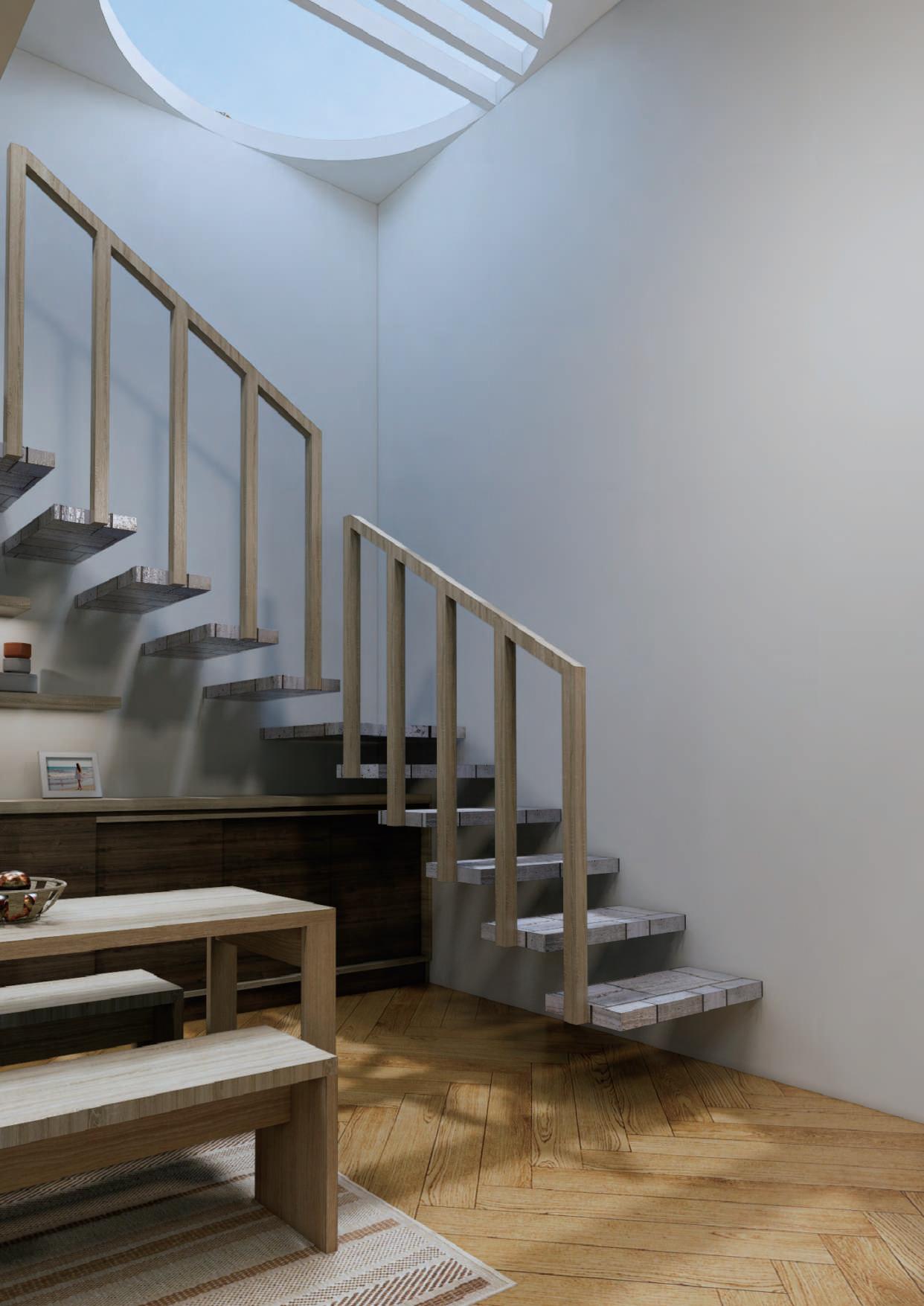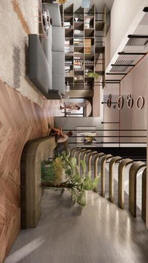 A、B方案樓梯間皆以「開窗」及「石板」做為材質規劃以對 應「明月松間照、清泉石上流」。