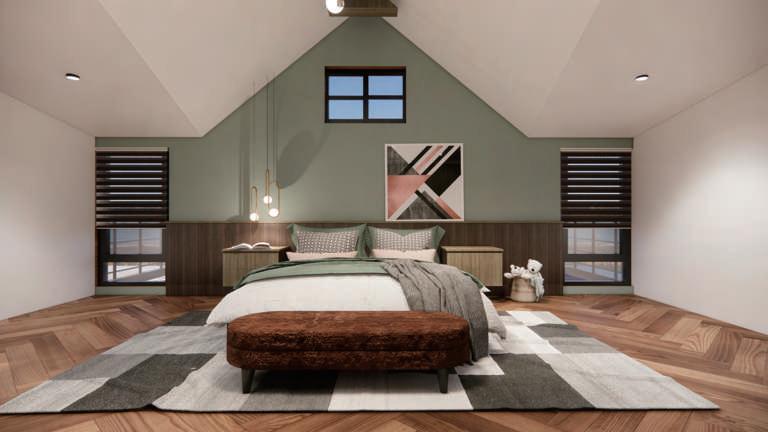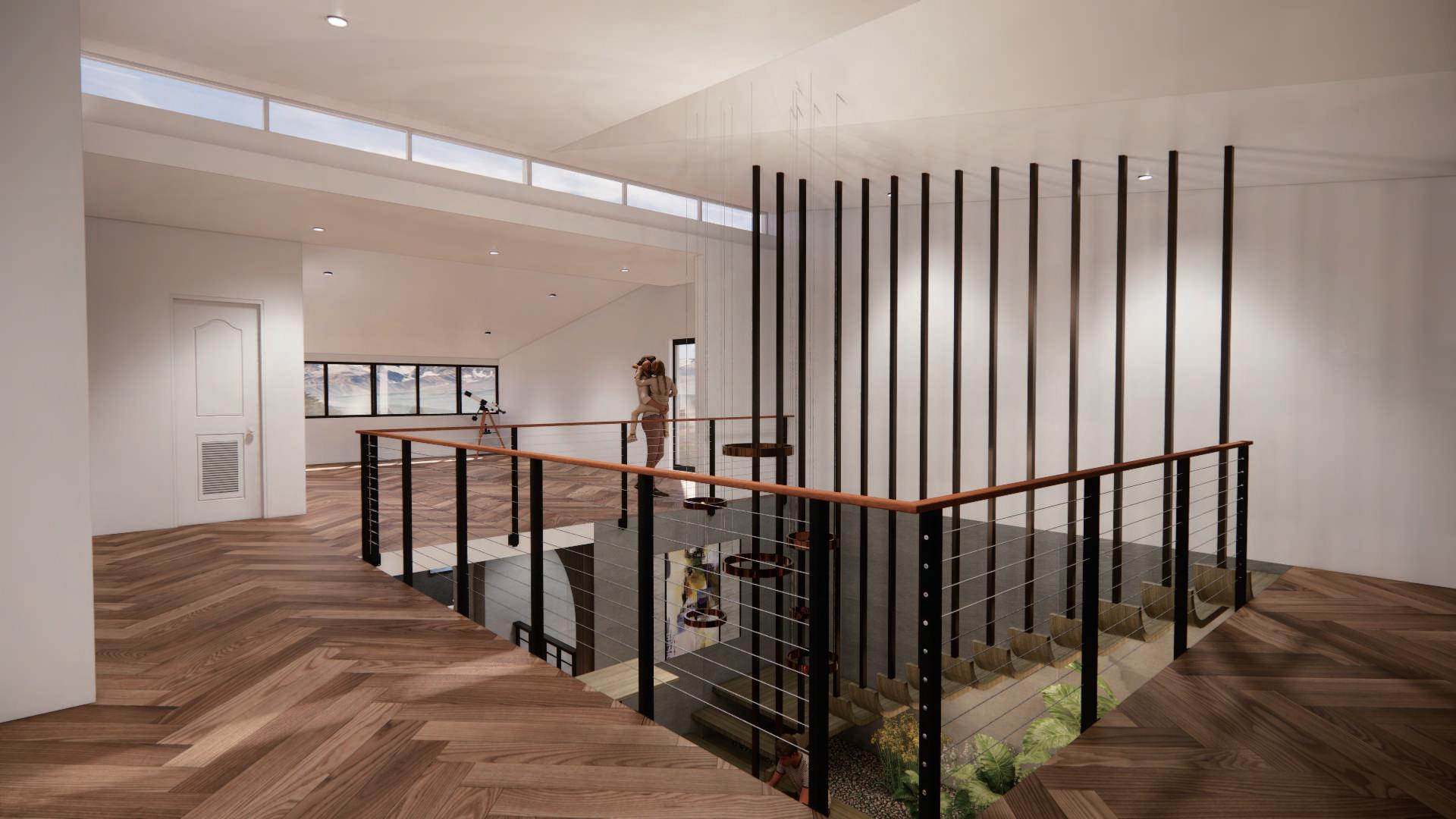二樓廊道直通衛浴、主臥室、起居空間,通透的方式讓整體室內視覺更加開闊、採光。