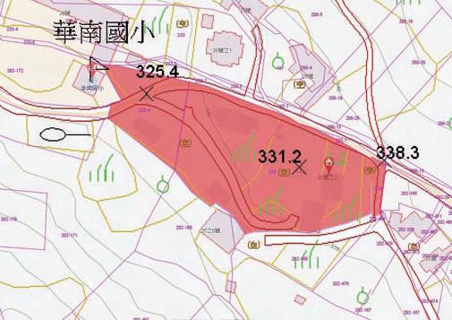 基地由現況營運中的「天空之夜泡腳 咖啡廳」之地段,為一坡地地形,海 拔高度最低325公尺;最高338公尺 ,整體座向為東南西北向。