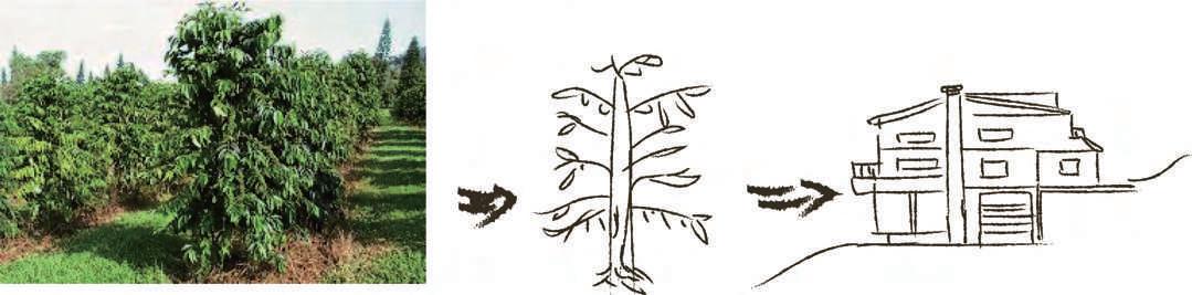 建築造型以咖啡樹的型態延伸發想,梯間與電梯象徵咖啡廳的樹莖 ,也是建築主要的垂直動線,梯間的水平空間延伸則是象徵葉脈的 開枝散葉,並沿用石砌擋土牆作為室外景觀牆。