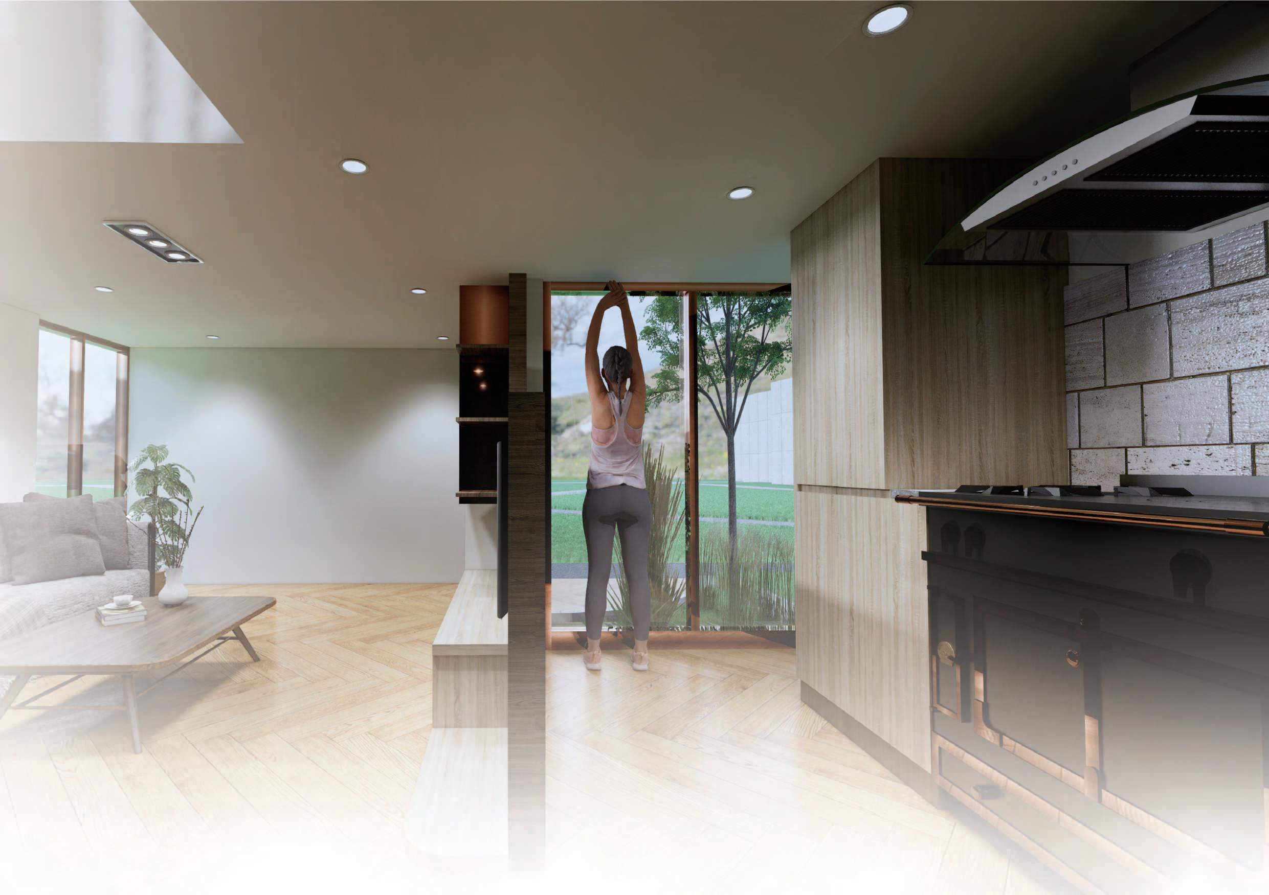 室內動線採客廳與廚 房分流,左側走廊以 活動拉門作為隔絕儲 物間與廚房通道,一 樓作為客廳、餐廳公 領域,二樓則以起居 、衛浴、臥室為主。