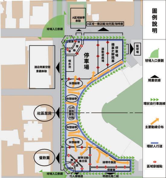 並透過建築量體計畫,整合 鄰近開放空間使其成為社區 連貫的主體,讓非體育設施 用地的附屬空間不只是社區 角落,而是都市開放空間的 生活場域,成為具有經濟價 值與體育花園文化形象的社 區環境。