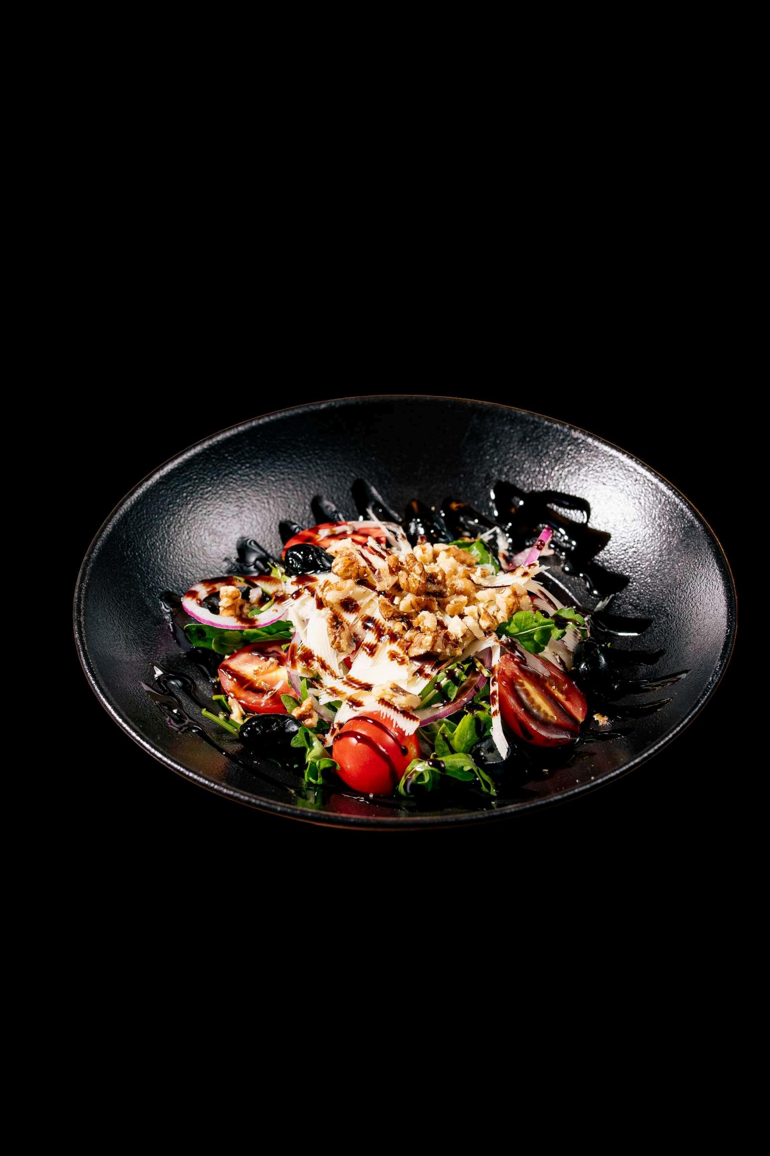 (Rucola, tomatoes, red onions, green salad, sa parmesan, balsamic, walnuts, sesame, black s