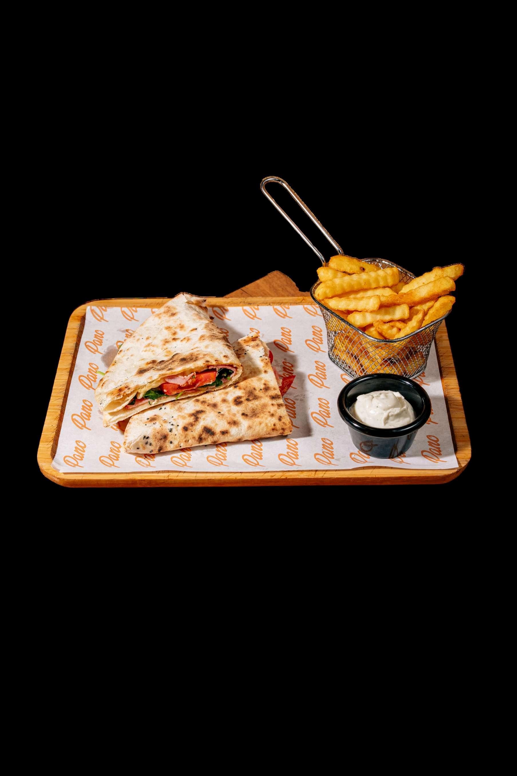 (Proshutëviçi,sosdomatesh,kaçkavall,sos pano,rukollë,domatina,balsamiko,pomfrit.)