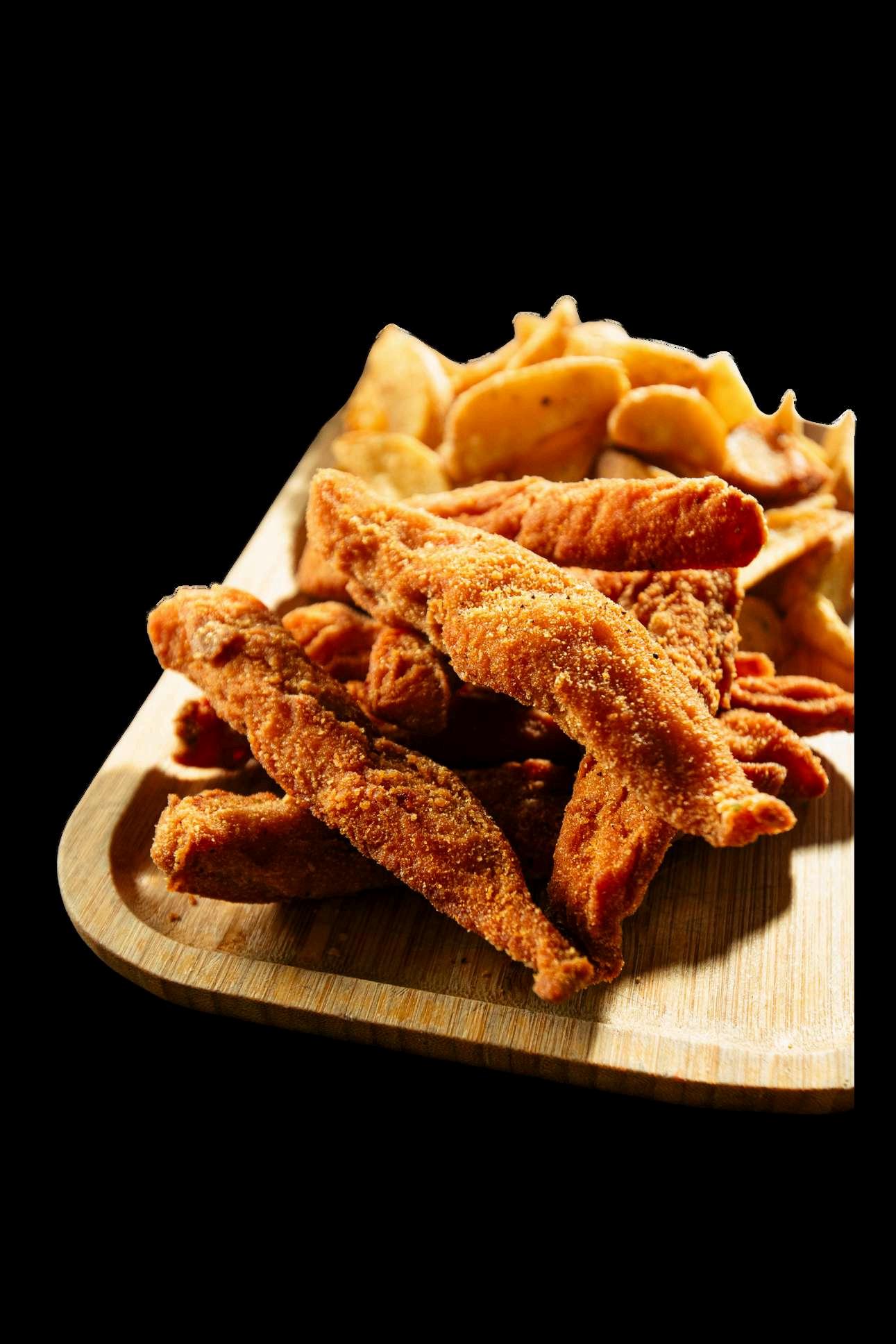 Chickenmeat,350gfriedwithpretzels,frenchfries mushroomsauce,riceandgarlicbread)