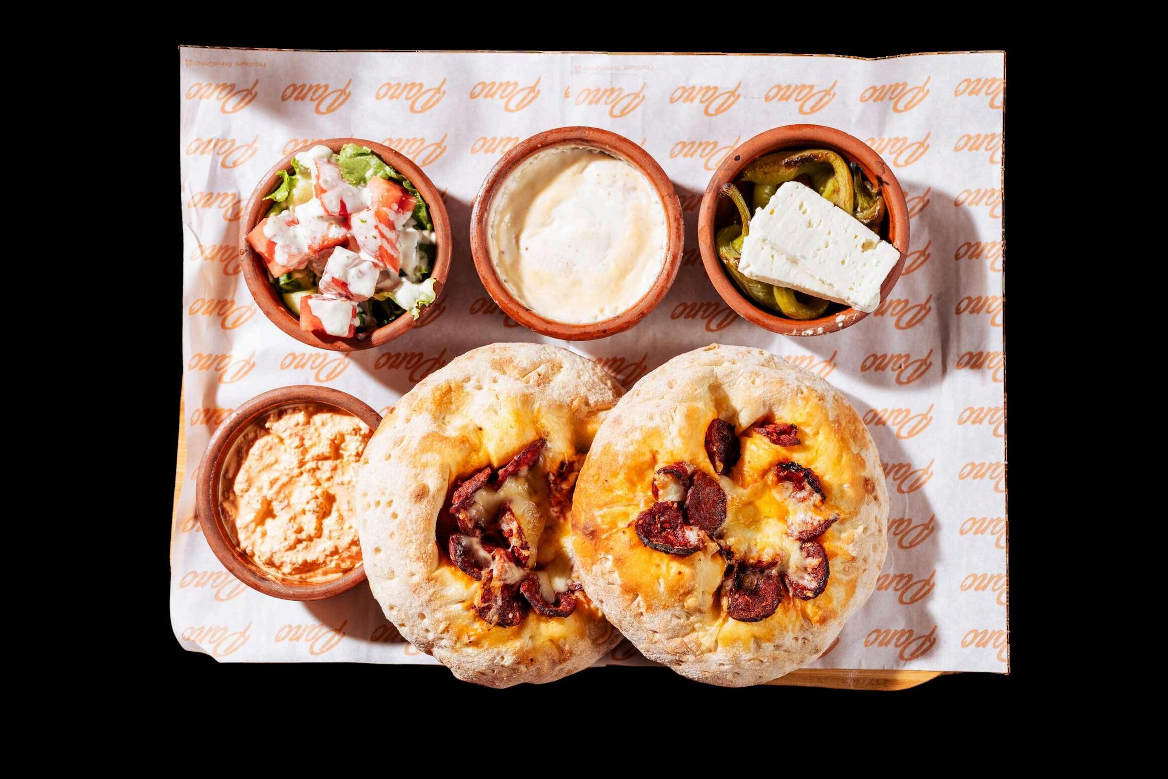 (Pogaqewithpepperoni,twokindsofcheeses,cold sauce,maza,roastedpeppers,tomatoes,cucumbers, greensalad saladdressing)