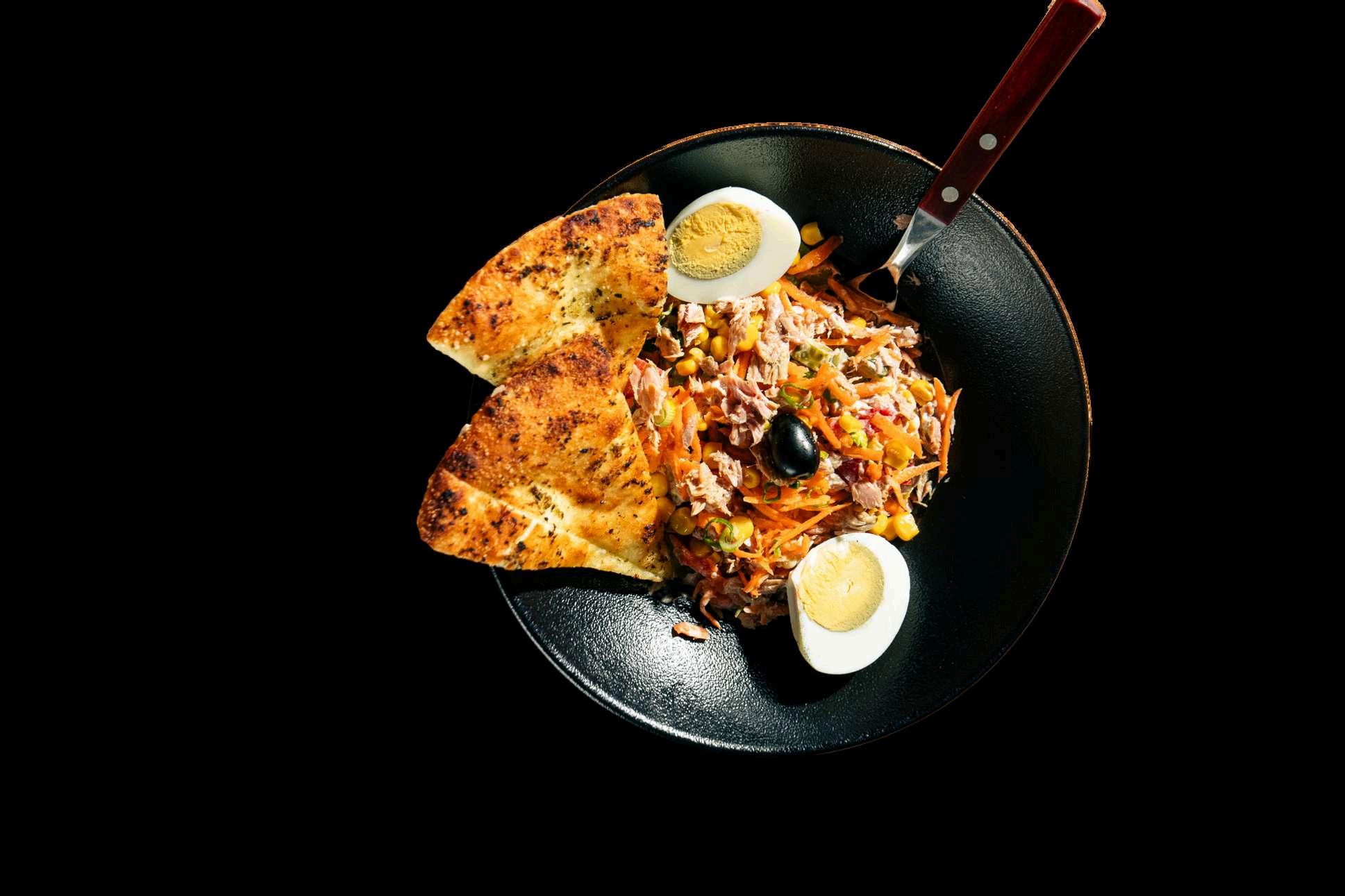 (Green salad, tomatoes, pickled cucumbers, c corn, onion, olive, tuna, boiled egg, salad dres and garlic bread) PotatoSalad,2.5