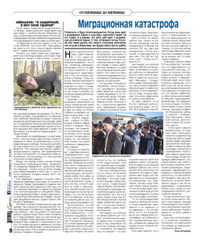 ачну с простой конста- быть рынка с тотальной нетации: район Бирюле- легальщиной, криминалом и во — это новый Хи- неуплатой налогов, покровитров рынок. Пресловутая По- тельствуемого местными чикровская овощебаза — это 10 новниками вроде главы месттыс. мигрантов, кавказцев и ной управы и члена «ЕдРа» криминала, потому что дав- Виктора Легавина, который но пора отказаться от пре- уже в разгар волнений разокраснодушного представле- рялся о том, какое это замения о том, что мигрант при- чательное предприятие и каезжает в Москву, чтобы ра- кие важные социальные проботать. Мигрант приезжает в граммы оно выполняет. На примере Покровской Москву, потому что в родном кишлаке он умрет с голода. овощебазы хорошо видно, Он приезжает в Москву пото- что «дешевыми» трудовые му же, почему голытьба сте- рабы являются только для калась в трущобы диккенсов- хозяев овощебазы и их покровителей вроде Легавиского Лондона. Бирюлево — это дно. Ког- на, а все общество — бирюда вечером нельзя выйти на левские школы, больницы и улицу, когда в школах целые пр. — платит за них двойную классы не говорят по-русски, цену. «Дешевизна» трудовоа еще это округ, в котором го раба в путинской России Собянин на выборах набрал больше всех голосов — 64,24%. Навальный набрал 18,58%. Больше Собянин набрал только в бывшем Подмосковье. Как правильно считает власть, именно жители гетто всегда голосуют за верховного стерха. Но, как выясняется, именно они грабят магазины и переворачивают машины. Ситуация в Бирюлеве — следствие курса, который взял Путин — курЗадержания на Покровской овощебазе. са на построение в России рабовладельческого об- состоит в том, что прибыль на рынке капусты. Если есть щества. Общества, в котором от его труда получает хозя- дефицит, значит, нет рынка. есть элита, имеющая доступ ин, а все расходы на трудово- Если в стране относительный дефицит рабочих рук, как в к бюджетным деньгам или к го раба оплачивает бюджет. При этом московские вла- Англии XIV в. после чумы, это административному ресурсу, позволяющему эксплуати- сти не только не пытаются прекрасно! Это ведет к повыровать рабов. Есть рабы, на собирать налоги с таких вот шению цены труда, к его эфкоторых лежит основная тя- овощебаз — они сами созда- фективности и механизации. жесть физического труда, и ют для трудовых рабов лиш- За исключением того, разуесть люмпен, которого дер- ние места, позволяющие меется, случая, когда губяжат на хлебе и зрелищах. освоить бюджет. Бессмыслен- щий страну режим решает, Этот стратегический курс со- ная трижды в год высадка од- что ему не нужны люди, полупровождается массой пропа- нолетников вдоль вылетных чающие за свой труд достойганды о том, что мы, русские, магистралей, чего нет ни в ное вознаграждение. А нужна не хотим работать, что в стра- одном городе мира, еще бо- ему элита, рабы и люмпены. То, что толпа прицепилась не нехватка рабочих рук, что лее бессмысленная стрижка труд мигрантов дешевле и пр. травы мигрантами вдоль до- именно к убийству 25-летнеПримечательно, что вся рог — что это, как не размно- го Егора Щербакова, зареэта риторика не стоит лома- жение рабов с целью освое- занного то ли таджиком, то ли кавказцем — это случайного гроша, когда сталкива- ния бюджета? Нам говорят, что «в России ность. Но то, что в Бирюлеется с реальностью — с Покровской овощебазой. Пото- не хватает рабочих 