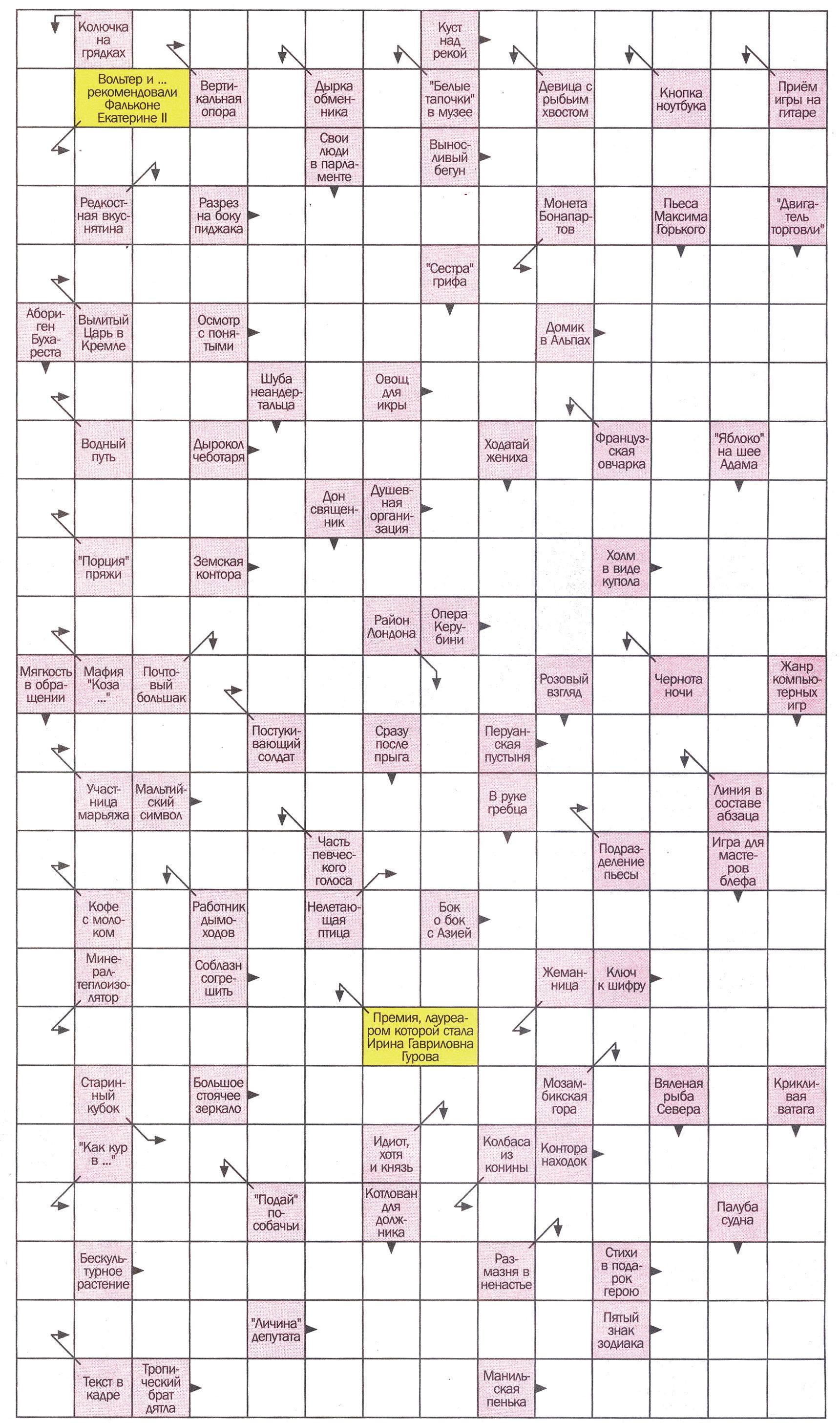 воин ское звание в армии. 48. Мастер фальшивых комплиментов. 49. Длинноно гая охотница на лягушек. 50. Лидер группы «Дюна». 51. Первый шаг к за кономерности. 52. Савелий с ролью дьяка Феофана в комедии «Иван Васи льевич меняет профессию». 53. Исследователь водных глубин. ПО ВЕРТИКАЛИ: 1. Гласность — это ... слова. 2. Кирилл, солист группы «Иванушки International». 3. Животное, что символизирует в геральдике преданность и повиновение. 4. Притягательная женственность. 5. И фотокамера, и теле фон, и ракета, и техника машинного доения. 6. Компактный рояль. 7. Рас кладывание тонким слоем. 8. Предмет одежды, который чаще всего мож но встретить на портретах Анны Ахматовой. 10. Пластинка с изображением, носимая на груди. 11. Раздражающий телезрителей двигатель торговли. 12. «Бумеранг» некачественного товара. 17. Процесс затыкания пробкой бутыл ки. 20. Отличительная черта лаконизма. 22. Народное название никчемно го человека. 24. Похвальное качество для сотрудника. 26. Марка японского автомобиля. 27. Несколько дворовых злых собак, пугающих прохожих. 32. Аксессуар футбольного арбитра, «отобранный»