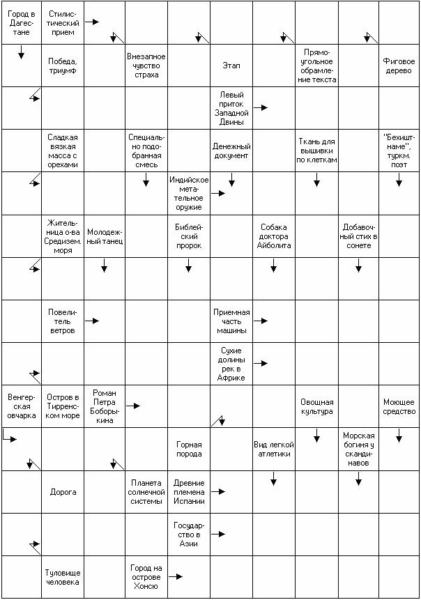 греков. 37. роды у ко ровы. 38. род многолетних корневищных трав семейства зонтичных. 39. кондитерское или мучное изделие. 41. женский и детский го ловной убор. 42. устройство на рельсовых пу тях для перевода подвижного состава с одно го пути на другой. 47. праздничная трапеза. 48. насыщенный алифатический углеводо род, используемый как добавка к авиацион ным бензинам. 50. крупная кобра. 52. Верх няя одежда православного духовенства. 53. род кувшина с крышкой. 56. Шумный пере полох, суматоха. 58. армянский феодал. 60. Сомнительная сделка. 62. отложение водных потоков. 63. карточная игра. 64. минерал, руда цинка. 65. Записи, ведущиеся изо дня в день. 66. империалистический блок Велико британии, Франции и царской россии. по вертикали: 1. Задвижка для запирания окон и дверей. 2. Верхняя откидывающаяся створка окна. 3. Французская мера длины. 4. Лиственное дерево. 5. наука о морали. 6. Буква кириллицы. 7. письменный указ ханов Золотой орды. 8. потеря, убы ток, урон. 9. чувство тоскливо-беспокойного страха. 10. Се ление в Северной италии, возле которого армия наполео на разгромила австрийцев. 11. Слово, образованное пере становкой букв другого слова. 17. Старинная крытая зимняя повозка. 18. Бренное .... 20. Высокая скала. 21. место дей ствия. 23. марка немецких автомобилей. 24. отрасль фи лологии. 26. Фильм александра довженко. 28. круг учреж дений и лиц, пользующихся кредитом данного банка и про водящих через него свои операции. 30. опера Сергея рах манинова. 31. Залив красного моря. 33. Стальной брус на шпалах. 34. декоративное растение. 39. Старинный город в узбекистане. 40. разгульная попойка. 43. установленная расценка товаров или норма оплаты. 44. древнегреческая морская богиня, спутница посейдона. 45. новогоднее пред ставление для детей. 46. Соевый творог. 47. подавляющее влияние. 49. Фильм испанского режиссера Луиса Бюнюэля. 51. человек, отвергающий любую веру в сверхъестествен ное. 54. Город в алтайском крае. 55. Степень зрелости зер на, плода. 56. краткий иносказательный нравоучительный рассказ, стихотворение. 57. Свойство, отличительная осо бенность. 59. представитель этнографической группы гру зин. 61. отец зятя.