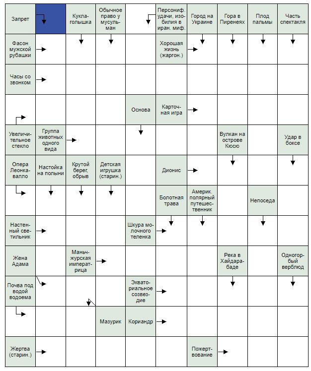 По вертикали: Митраизм. Колер. Иосиф. Станнит. Тальони. Штоф. Арит. «Икар». Саки. Мопс. Роже. Утка. Лир. Папа. Оракул. Герб. Багги. Титр. Уруп. Пётр. ***