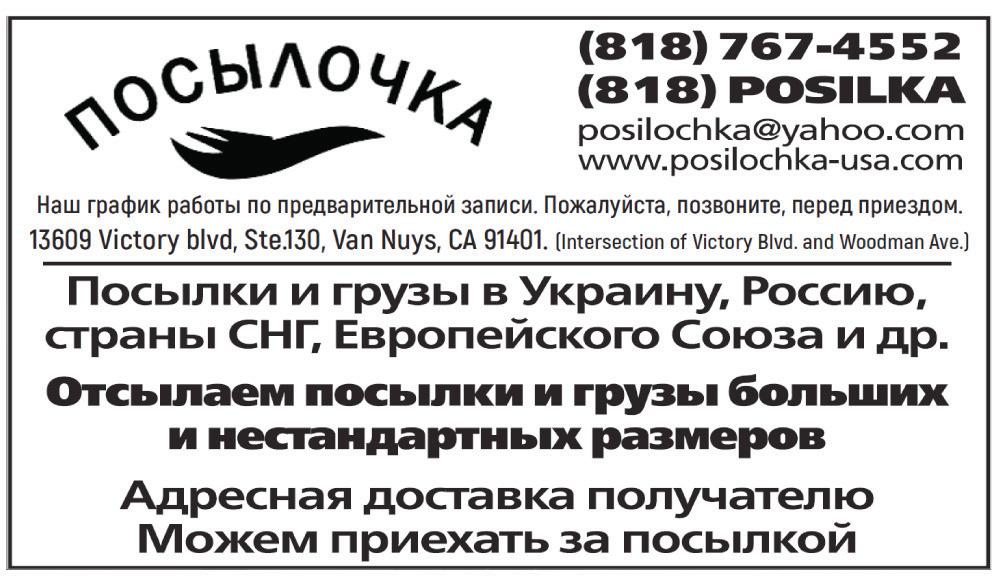 nанорама panorama media group A21 almanac panorama #51 (2176), December 21 - 27, 2022 www.panorama-e.com tel: (323)463-7224 fax: (323)460-2980 Нас не надо искать. В Калифорнии мы везде, где говорят на русском языке Газету прошу направлять (писать по-английски): Name: Address: Tel: panorama Media Group, 3575 Cahuenga Blvd. W, ste 405, Los Angeles, CA 90068 ***** Tel. 323/463-7224 ДосТАВКА ПерВым КлАссом! 12 мес. 6 мес. 3 мес. $120 $60 $30 Прошу ПоДПИсАТь меНЯ НА гАзеТу Нас не надо искать. В Калифорнии мы везде, где говорят на русском языке “ПЯТНИЦА ExprEss” Прилагаю чек (мани-ордер) на сумму $ Газету прошу направлять (писать по-английски): Name: Address: Tel: panorama Media Group, 3575 Cahuenga Blvd. W, ste 405, Los Angeles, CA 90068 ***** Tel. 323/463-7224 ДосТАВКА ПерВым КлАссом! 12 мес. 6 мес. 3 мес. $120 $60 $30 Прошу ПоДПИсАТь меНЯ НА гАзеТу ПоДПИсКА Нас не надо искать. В Калифорнии мы везде, где говорят на русском языке. $187 $98 $52 в разделе classifieD: • стоимость частНого оБъявлеНия до 1 2 слов на 1 неделю - 10 долл. каждое дополнительное слово - 50 центов • стоимость БизНес-оБъявлеНия до 1 2 слов на 1 неделю - 13 долл. каждое дополнительное слово - 50 центов объявление в рамке - на 2 долл. дороже текст вашего объявления вместе с чеком на имя Panorama Media Group отправьте по адресу: 3575 cahuenga Blvd. W, suite 405, los angeles, ca 90068 ИНДИВИДУАЛЬНАЯ АКАДЕМИЧЕСКАЯ ПРОГРАММА ■ Музыка ■ Балет, пение ■ Рисование ■ Драма ■ Иностранные языки ■ Естественные науки ■ Экскурсии ■ Компьютер 36 2018 927 N. Fairfax Ave. West Hollywood, CA 90046 (323) 654-9920 11728 Moorpark Str. Studio City, РАБОТАЕТ ЛЕТНИЙ ЛАГЕРЬ 927 N. Fairfax Ave. West Hollywood, CA 90046 (323) 654-9920 14926 Burbank Blvd. Sherman Oaks, CA 91411 (818) 786-0301 6447 Woodman Ave. Van Nuys, CA 91401 (818) 786-5169 11728 Moorpark Str. Studio City, CA 91604 (818) 766-5557 РАБОТАЕТ ЛЕТНИЙ ЛАГЕРЬ ОТКРЫТЫ с 6.30 утра до 6 вечера ЯСЛИ•ДЕТСКИЙ САД•НАЧАЛЬНАЯ ШКОЛА 3-разовое питание www.abclittleschools.com СТАРЕЙШИЙ РУССКОЯЗЫЧНЫЙ ДЕТСКИЙ САД В ЛОС-АНДЖЕЛЕСЕ был открыт в 1979 году www.justlikemomspreschool.com info@justlikemomspreschool.com 323/874 - 6032 7.30 am - 6 pm 323/851 - 1919 6 pm - 8 pm •1535 N. Poinsettia Place •1444 N. Spaulding Ave JUST LIKE MOM’S ÂÑÅ ÊÀÊ Ó ÌÀÌÛ ЯСЛИ, ДЕТСАД, ПОДГОТОВИТЕЛЬНЫЙ И ПЕРВЫЙ КЛАССЫ ► Академическая программа, основанная на методиках лучших школ Европы и Америки ► Англ. и русск. языки, математика, музыка, танцы, рисование, гимнастика и мн. др. ► 4-разовое питание, тихий час ► Работает двуязычный логопед ► Спортивные и музыкальные занятия, игры, театральные постановки, рисование и поделки ► В летнее время на территории детского сада работает лагерь. Возраст детей 5-6-7 лет Дирекция: Элеонора КОРОЛЬ, Марина ПОДЕЛЬКО детсады - обучение Ремонт - стРоительство Интересные знакомства в вашем городе «Страницы знакомств» помогут найти идеальную любовь или новых друзей! Обращайтесь к нам. Разместите свое объявление, и мы поможем вам. 323.463.7224 знакомство 3575 cahuenga Blvd. W, suite 405, los angeles, ca 90068 VstrechaUSA@gmail.com Объявления в газете «Панорама» на стр. А22-23 Циклевка, шлифовка, 3 слоя лака. установка Паркета, ламината, лестниЦ. укладка Плитки и Покраска стен. 818/699-5959 миша 2161-2176 • С БОРКА, РА з Б ОРКА И УСТАНОВКА МЕБЕЛИ, ТЕЛЕВИ з О РОВ, ЛЮСТР И БРА, з А МЕНА КРАНОВ • У С ТАНОВКА д В ЕРЕ й И з А МКОВ • Н А СТИЛ ПОЛОВ И з ЛАМИНАТА • П ОКРАСКА СТЕН И ПОТОЛКОВ 818-416-4584 Андрей ОкАжу пОмОщь в рАбОте пО дОму: 2111-2145 внимание! П О ПУЛ я Р НЫ й К НИ ж Н Ы й М АГА з И Н “К О ВЧЕГ” ПЕРЕШЕЛ НА ПРО д А ж У СВОЕГО ТОВАРА ЧЕРЕ з E На нашем сайте вы сможете приобрести КНИГИ д Л я В з Р ОСЛЫ х, д Е ТЕ й И СУВЕНИРЫ на любой вкус. Ждем вас, друзья. ebay.com/usr/kovcheg_la с помощью иНтерНет-версии Нашего издаНия вы можете разместить свое оБъявлеНие в газете, которую читает вся америка! звоните: 323-463-7224 Читайте 