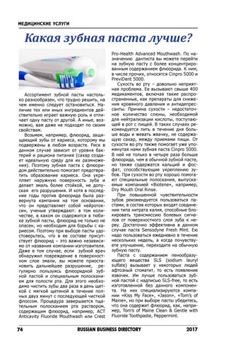 Pro-Health Advanced Mouthwash. По назначению дантиста вы можете перейти на зубную пасту с более концентрированным содержанием флюорида. К ним, в числе прочих, относятся Cinpro 5000 и PreviDent 5000. Сухость во рту – довольно неприятная проблема. Ее вызывают свыше 400 медикаментов, включая такие распространенные, как препараты для снижения кровяного давления и антидепрессанты. Причина сухости – недостаточное количество слюны, необходимой для нейтрализации кислоты, поступающей в рот с пищей. В таких случаях рекомендуется пить в течение дня больше воды и жевать жвачку, не содержащую сахар, между приемами пищи. От сухости во рту также помогает уже упомянутая нами зубная паста Cinpro 5000. В ней не только в четыре раза больше флюорида, чем в обычной зубной пасте, но также содержатся кальций и фосфат, способствующие укреплению зубов. При сухости во рту хорошо помогают специальные полоскания, выпускаемые компанией «Biotene», например, Dry Mouth Oral Rinse. При повышенной чувствительности зубов рекомендуется пользоваться пастами, в состав которых входят соединения типа нитрата калия, способные блокировать трансмиссию болевых сигналов от поверхностного слоя зуба к нерву. Достаточно эффективна в данном случае паста Sensodyne Fresh Mint. Ею надо пользоваться ежедневно в течение нескольких недель, а когда почувствуете улучшение, переходите на обычную зубную пасту. Паста с содержанием пенообразующего вещества SLS (sodium lauryl sulfate) вызывает у некоторых людей афтозный стоматит, то есть появление язвочек. Им лучше пользоваться зубной пастой с надписью SLS-free, то есть изготовленной без данного компонента. На них специализируются компании «Kiss My Face», «Jason», «Tom’s of Maine», но при выборе пасты убедитесь, что она содержит флюорид, как, например, Tom’s of Maine Clean & Gentle with Fluoride Toothpaste, Peppermint.