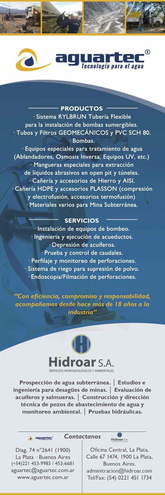 Dirección y Administración: PM Servicios Empresarios S R L Congreso 2440 piso 2 - Buenos Aires Argentina - Suscripciones: Argentina: $ 10 000, Exterior: U$S 200 + Gastos de envío (que varían según el país); suscripción on-line: U$S 100 Panorama Minero es una revista de opinión e información minero-industrial Con registro de propiedad intelectual N°5128944 Afiliada a APTA Circula entre profesionales de todas las industrias de base mineral, empresas en general organismos del Estado institutos y centros de investigación universidades representaciones diplomáticas y proveedores de máquinas y equipos Nacionales y Extranjeros Impreso en Gráfica Cogtal, Rivadavia 755 - C A B A