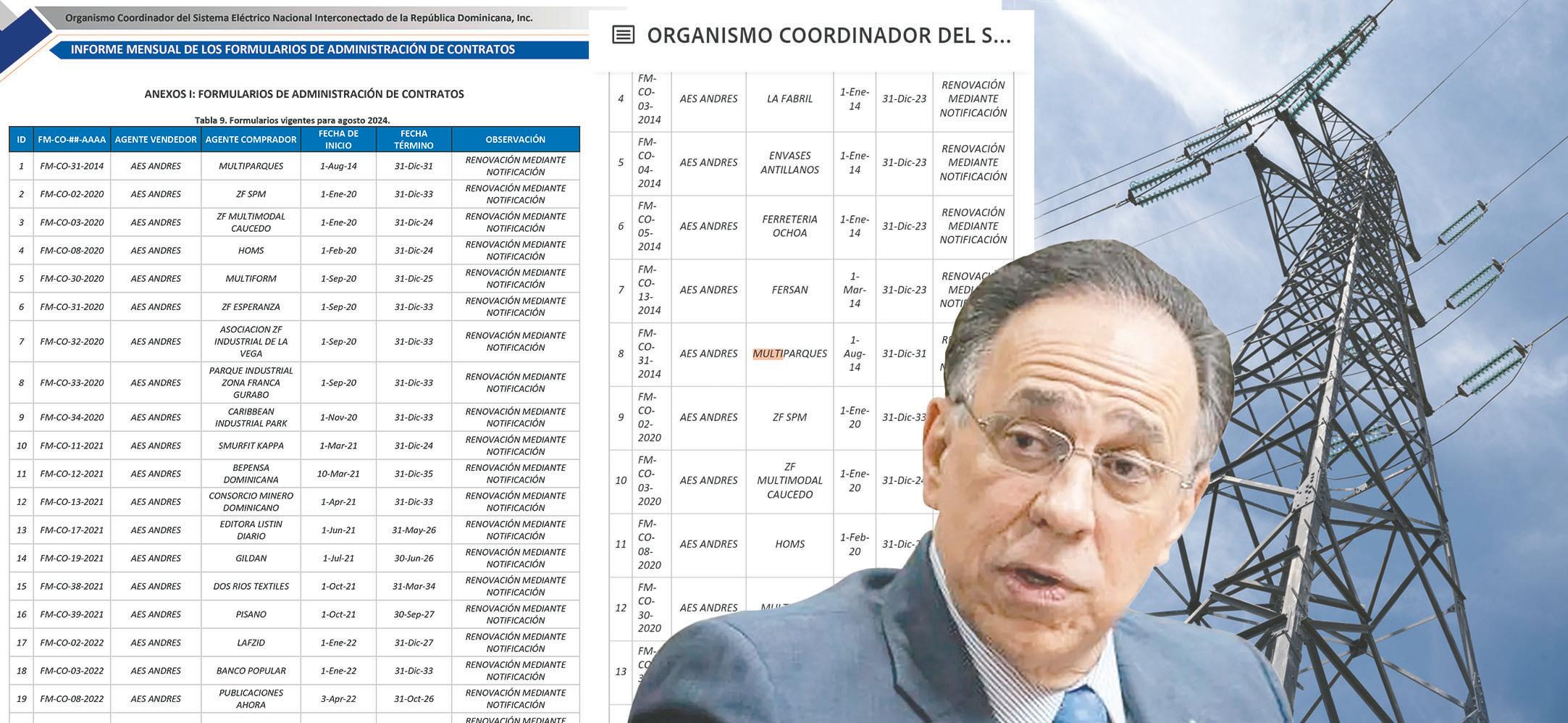 A saber: según el informe mensual de los formularios de administración de contratos del Ministerio de Energía y Minas, de agosto 2024, contenido en el documento oficial del organismo Coordinador del Sistema Eléctrico Interconectado, la empresa Multiparques, propiedad de Celso Marranzini, suscribió un contrato de compra de energía con la Empresa de Generación Hidroeléctrica Dominicana (Egehid).
