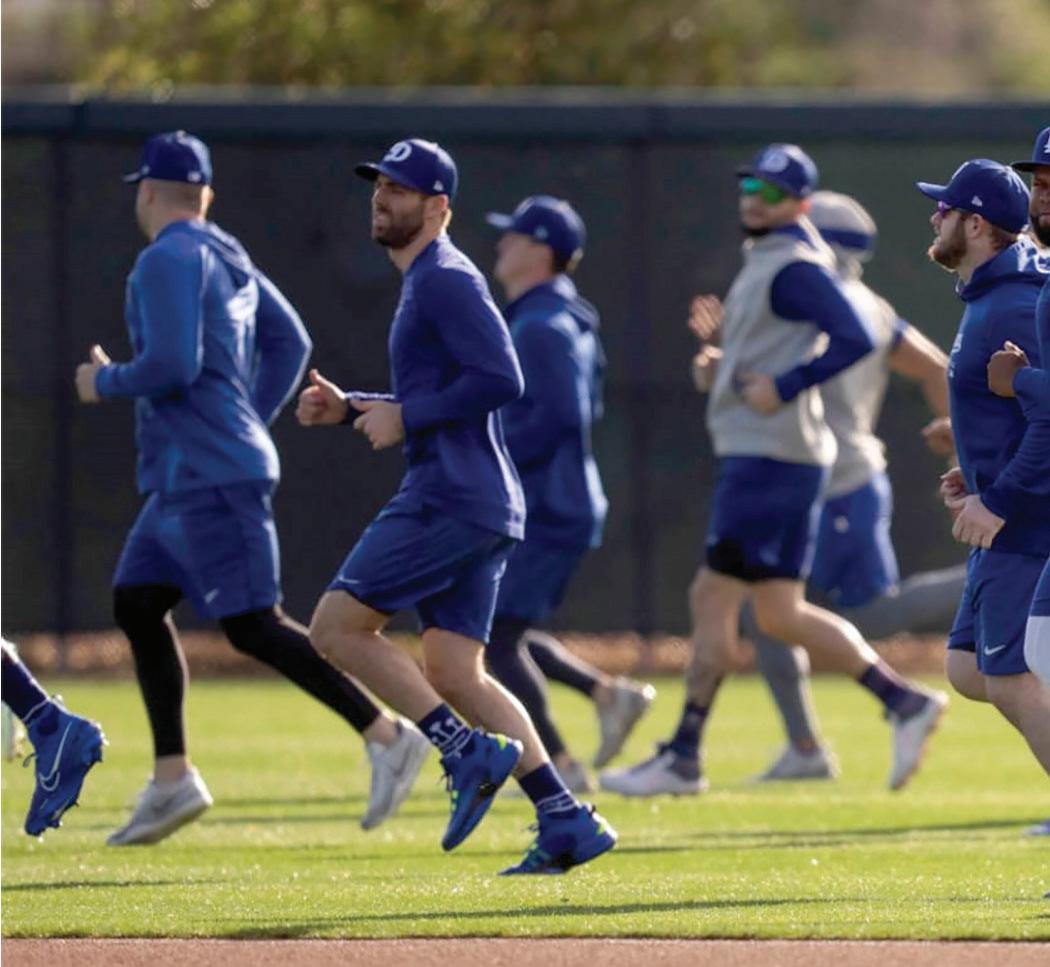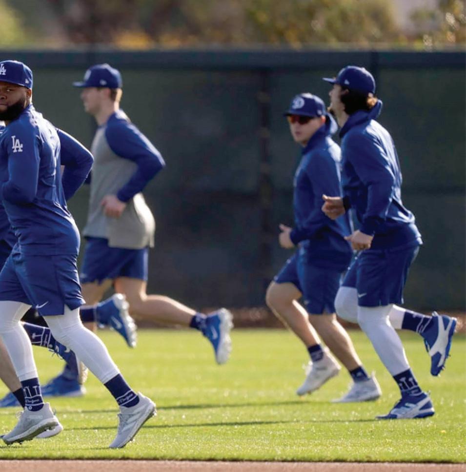 Jugadores de los Dodgers de Los Ángeles se alistan previo a una sesión de entrenamientos. Manuel Margot y Teoscar Hernández son dominicanos llamados a ser claves en aspiraciones del equipo.