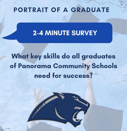 WE NEED YOUR INPUT! Starting with the end in mind, our district is working to create a picture of what key skills all graduates of Panorama Community Schools need for success. This "Portrait of a Graduate" will be developed with input from our community, including students, parents, graduates, teachers, and school personnel as well as business and community members. Once complete, it will serve as our "north star" for future efforts and direction. Please provide your thoughtful input to the following questions. The survey should take 2-4 minutes to complete. Thank you for your help!