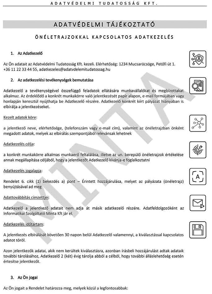 4.2. Tájékoztatókivonat mint első lépcsős tájékoztatás Hiszek a lépcsőzetes tájékoztatásban, mivel ez kedvező az érintett számára, így elérheti a célját. Ennek érdekében célszerű olyan adatkezelésitájékoztató-kivonatot készíteni, amely tartalmazza a legfontosabb információkat (adatkezelő neve és elérhetősége, adatkezelési cél, a megőrzés időtartama stb.) és azt, hogy a részletes tájékoztató hol található. Ebben az esetben az adatkezelés jellemzőit ikonokkal is lehet helyettesíteni, mivel a második lépcsőben rendelkezésre áll a részletes, szöveges tájékoztatás. A kivonat tartalmazhat ikont arra vonatkozóan, hogy az adatokat nem továbbítják harmadik országba, illetve nem kerül sor a személyes adatok különle-