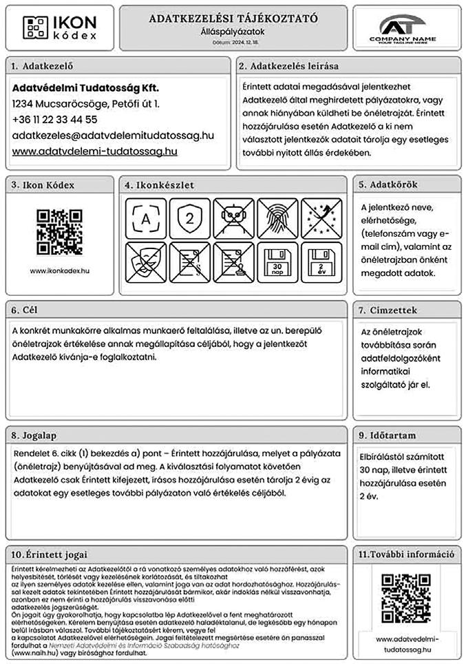 Az Ikon Kódex egy bárki által ingyenesen alkalmazható rendszer, az adatkezelési tájékoztatás során lehet felhasználni. Az Ikon Kódex tartalmaz egyfelől egy ikonkészletet, illetve egy közérthető, ugyanakkor jogilag precíz leírást, amely elérhető a www.ikonkodex.hu