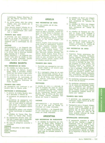 pi os cidadãos do Brasil que chegam do Brasil, Chile, Paraguai e Uruguai, portadores de "parteira 'de identidade" 3- os cidadãos do Chile que chegam do Brasil, Chile, Paraguai e Uruguai, portadores de"cédula de ide ntidad", 4. os cidadãos do Paraguai que chegam do Brasil, Chile, Paraguai e Uruguai, portadores de "cédula de identidad ou "Libreta de enrolamiento", 5. os cidadãos do Uruguai, que chegani do Brasil, Chile, Paraguai e Uruguai, portadores de "cédula de identidad" ou "credencial civil", NÃO NECESSITAM DE VISTO os cidadãos de: Argentina, Países americanos (exceto Cuba), Alemanha Ocidental, Áustria, Belgica, Dinamarca, Espanha, Firilandia, França, Grã-Bretanha (portadores de passaportes britanicos com a inscrição na capa "United Kingdom of Great Britain and Northern Ireland" ou "Jersey" ou "Guernsey and its dependencies", e com a anotação "british subject, citizen of the United Kingdom, islands and colonies"), Grécia, Irlanda, Itália, Japão, Holanda, Liechtenstein, Luxemburgo, Noruega, Suécia e Sulca, como turistas até 3 meses. 2. Os residentes estrangeiros portadores de Visto de retorno, 3. Os residentes estrangeiros portadores de cédula de identidade: Argentina e pasaporte com menos de dois anos fora do país. Os estarngeiros citados acima como isentos de passaporte poderão entrar somente com "cédula", TRÂNSITO SEM VISTO 1. E permitido aos passageiros que continuam viagem dentro de 48 horas após a chegada.