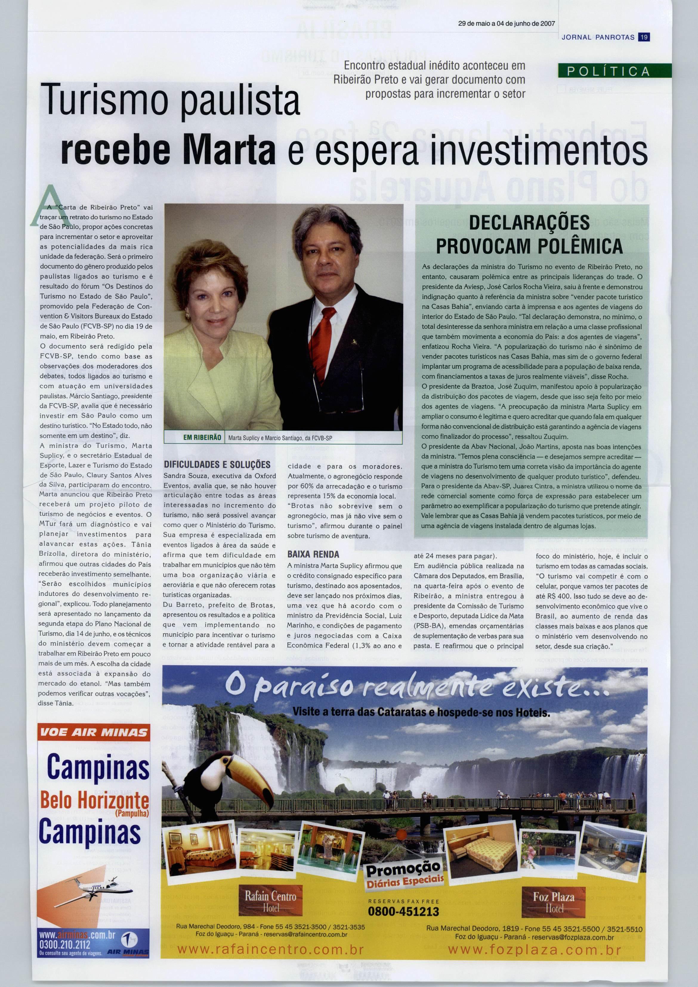 As declarações da ministra do Turismo no evento de Ribeirão Preto, no entanto, causaram polêmica entre as principais lideranças do trade. O presidente da Aviesp, José Carios Rocha Vieira, saiu à frente e demonstrou indignação quanto à referência da ministra sobre "vender pacote turístico na Casas Bahia", enviando carta á imprensa e aos agentes de viagens do interior do Estado de São Paulo. "Tal declaração demonstra, no mínimo, o total desinteresse da senhora ministra em relação a uma classe profissional que também movimenta a economia do Pais:a dos agentes de viagens", enfatizou Rocha Vieira."A popularização do turismo não é sinônimo de vender pacotes turísticos nas Casas Bahia, mas simdeo governo federal implantar um programa de acessibilidade para a população debaixa renda, com financiamentos a taxas de juros realmente viáveis", disse Rocha.
