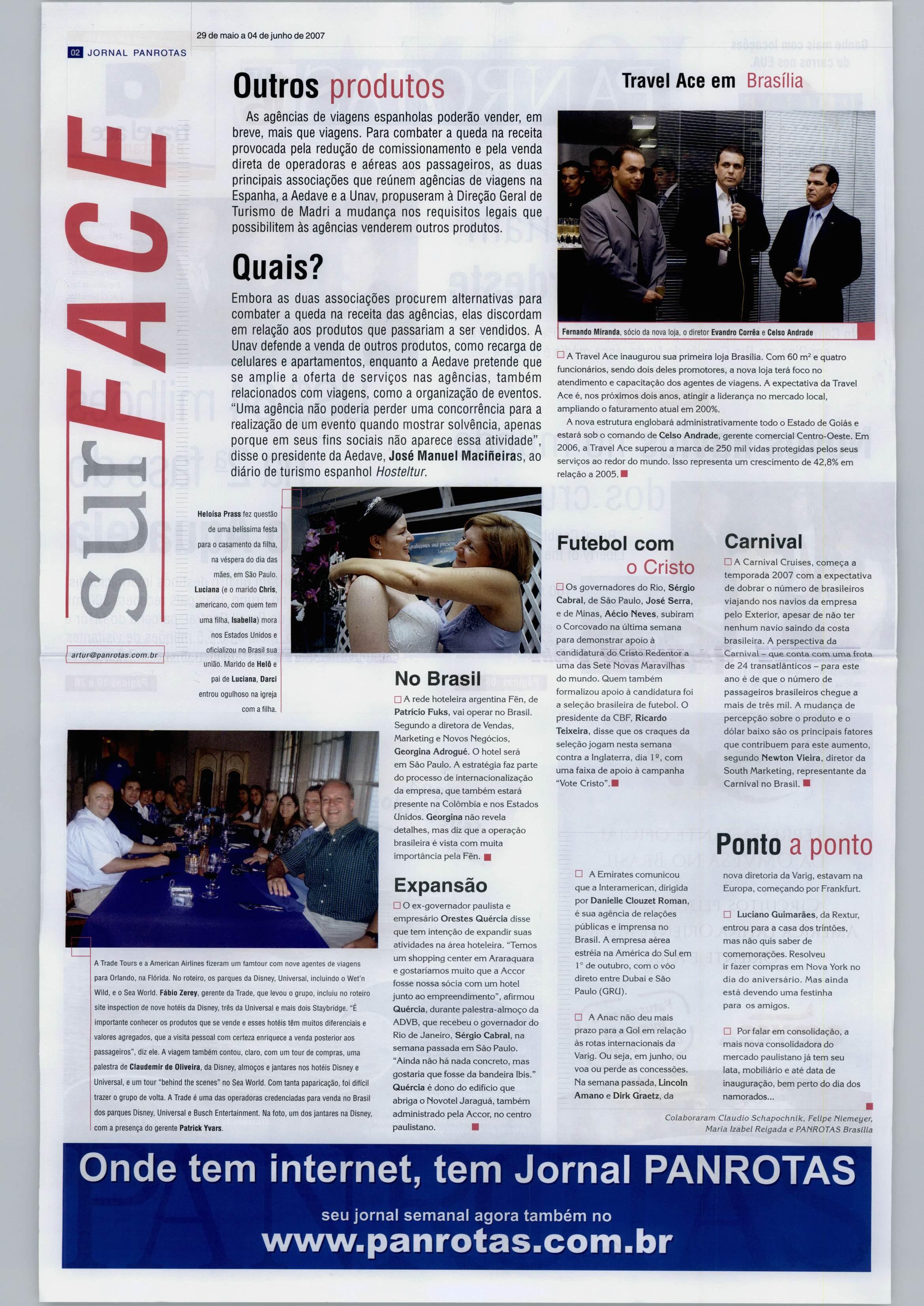 •A Travei Ace inaugurou sua primeira loja Brasília. Com 60e quatro funcionários, sendo doisdeles promotores, anovalojateráfocono atendimento e capacitação dos agentes de viagens. A expectativa daTravei Aceé,nospróximosdoisanos,atingira liderança no mercado local, ampliando o faturamento atual em 200%.