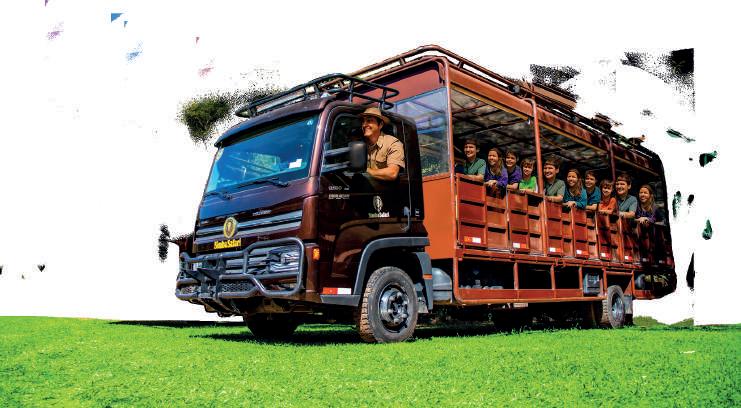 de quatro quilômetros, entre áreas verdes e habitats, e dura, em média, 30 minutos. O formato foi pensado com foco no bem-estar dos animais e na segurança do público. Além do passeio, o parque conta com bomboniere, café e espaço para fotos oficiais, tornando-se uma atração completa para famílias, turistas e escolas.