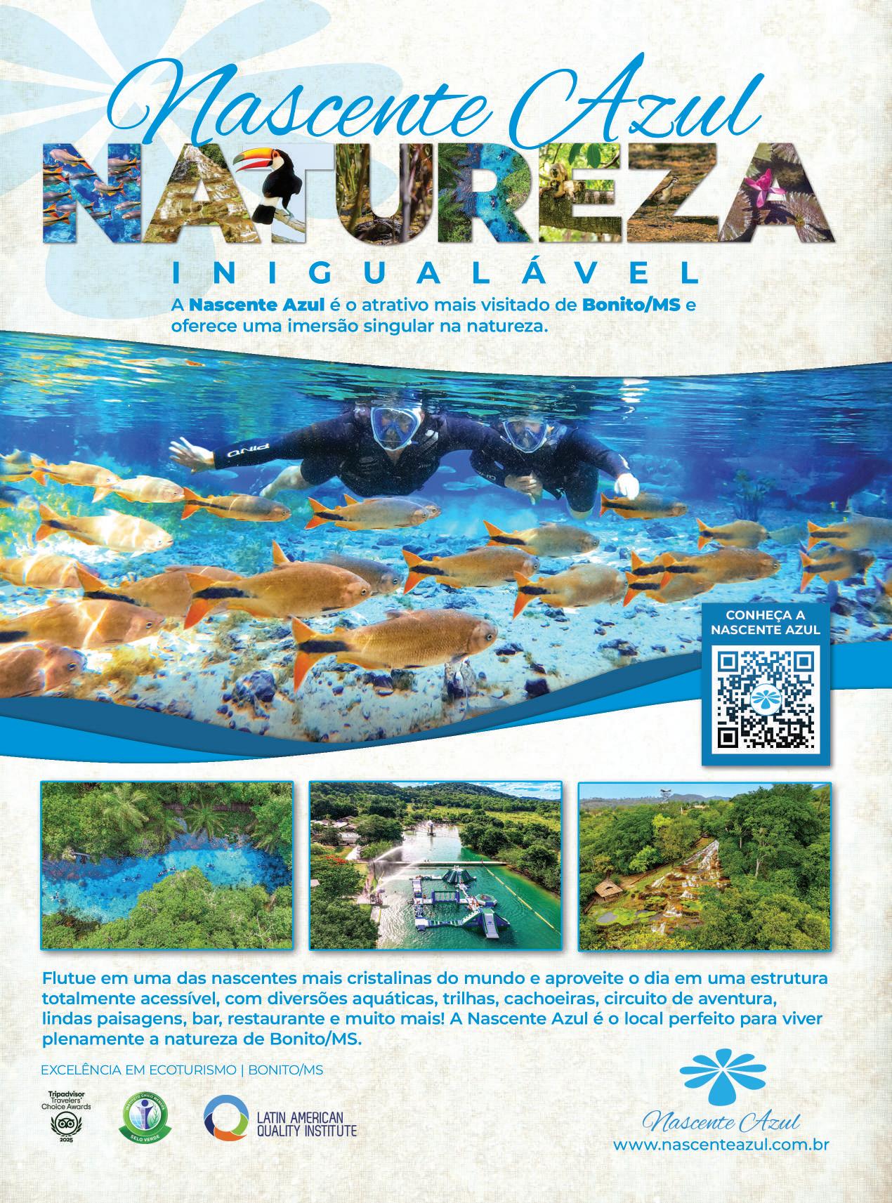 A Nascente Azul é o complexo de ecoTurismo mais visitado de Bonito, no Mato Grosso do Sul, reunindo experiências que criam uma conexão profunda com a natureza. Seu destaque é a Flutuação na Nascente Azul, uma das nascentes mais cristalinas do mundo, com mais de 60 metros de visibilidade, rara tonalidade azul-turquesa e alta vazão. Durante o passeio de snorkeling, o visitante contempla cardumes coloridos, jardins aquáticos e a tranquilidade do ambiente submerso.