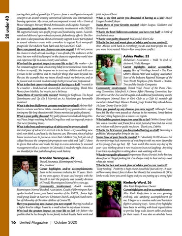 faith in Jesus Christ. What is the first career you dreamed of having as a kid? Major League Baseball player Name three of your favorite movies? Major League, Gladiator and Braveheart What is the best Halloween costume you have ever had? A bottle of siracha hot sauce What is your guilty pleasure? McDonald’s Diet Coke What is the best and worst piece of advice you’ve ever received? Best- Always work hard in everything you do and treat people the way you want to be treated. Worst—Run away from conflict. Ashley Walter, 33 Alzheimer’s Association – Walk To End Alzheimer’s, Walk Manager Career highlights and/or accomplishments: Best of Weddings Award – The Knot (2019); Illinois Hotel and Lodging Association Stars of the Industry Regional Manager of the Year (2018); Employee of the Month – DoubleTree and the Snyder Companies Community involvement: United Way’s Power of the Purse Planning Committee; Marcfirst’s A Divine Affair Planning Committee; Jaycee’s Brews at the Zoo and Bruegala and additional fundraising events; Bloomington Normal Boys & Girls Club as a Club 92 monthly gift member; United Way’s Women United group; United Way’s Read Across McLean County Day in 2020 Have you passed up any chances you now regret? Although I may have felt like they were passed up chances in the moment, I truly believe that everything happens for a reason –no regrets. Who had the greatest impact on your life so far? Debbie Haney-Kath. She was a coworker and friend for a short period of time but her words and wisdom will forever guide my future. Thank you, Debbie. What is the first career you dreamed of having as a kid? Becoming a published photographer living in the city. Name three of your favorite movies? It. I absolutely HATE clowns, but the movie brings back memories of watching it with my mom (probably at too young of an age ha); Elf. I can watch this movie any day of the year – just thinking about it now makes my bust out laughing; Anything I can trick my daughter in sitting down and watching with me. What is your guilty pleasure? Impromptu Dance Parties! In the kitchen, dancefloor or Target parking lot, I’m always ready to bust out my sweet white girl moves! What is the best and worst piece of advice you’ve ever received? “Keep Smiling.” Positivity is huge in our household (just ask my 13-yearold how many times I force it down her throat), but sometimes it’s OK to let the world know you aren’t happy and you are putting up a strong fight! Kimberly Ward, 36 Miss Kim’s Konfections, Owner Career highlights and/or accomplishments: Miss Kim’s Konfections is an ever growing, evolving, and satisfying accomplishment for me. It began as a creative outlet and has taken flight in amazing ways. Some of my highlights have been in working with local organizations to provide large scale dessert tables and treats for their events. It was also an absolute honor