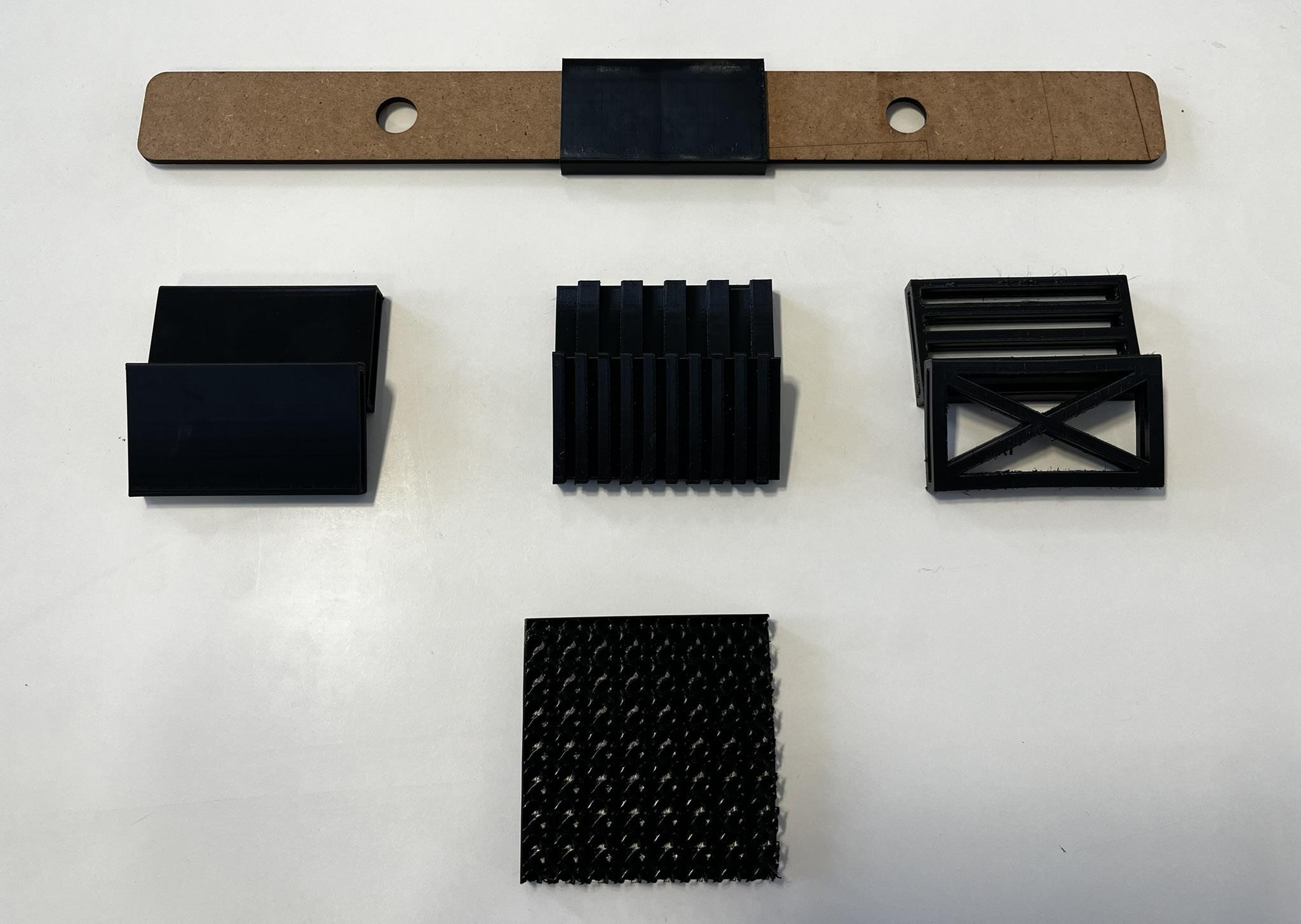 To find the most flexible in terms of bending we trialed different infills at two different densities (5%,25%). At the bottom right image idicated is the scaled Gyroid infill, that was chosen, scaled to be observed.