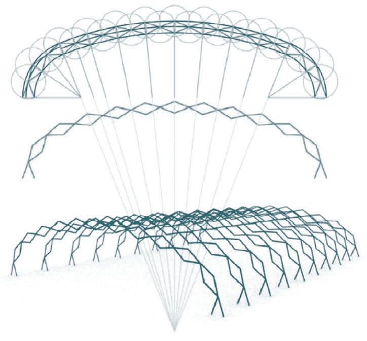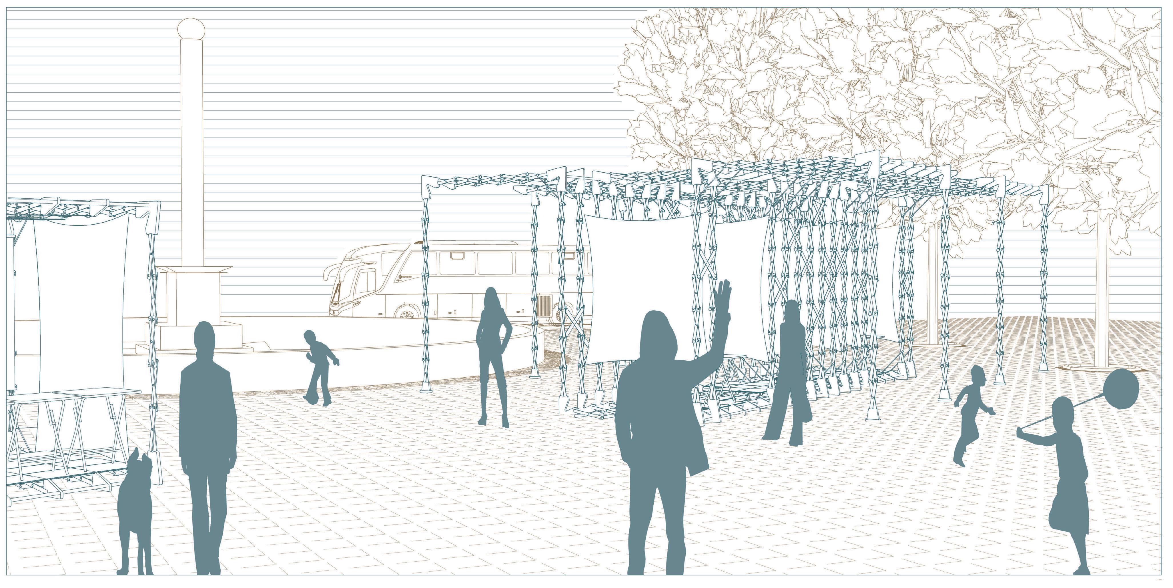The final concept concluded on an electric truck that has the ability to include structures of multiple uses (kitchen, kiosk, stage, shade). Each structure works independently with its own flexible solar panels and battery packs. The scissor structures also include a flexible joint that is used in both section views as well as plan views. In section view the flexible joint, which is 100% recyclable and is created from natural materials, connects the wall floor and ceiling of the structure. In plan view we have inbetween each scissor the flexible joint to be able to bend them and create multiple plans to accomodate different sites.