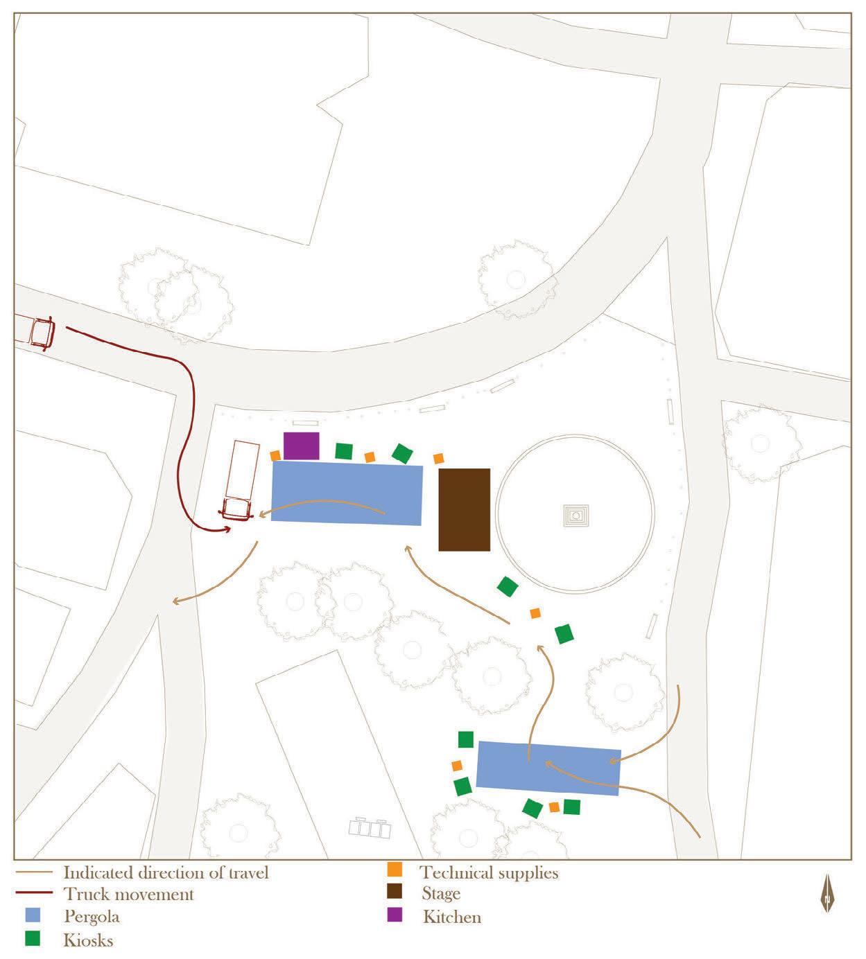 This event is the smallest and most compact. It only needs a couple of shade structures and 3-4 kiosks to opperate and has a more open character. It is a central location that will attract many visitors to get informed about the nature of the events.