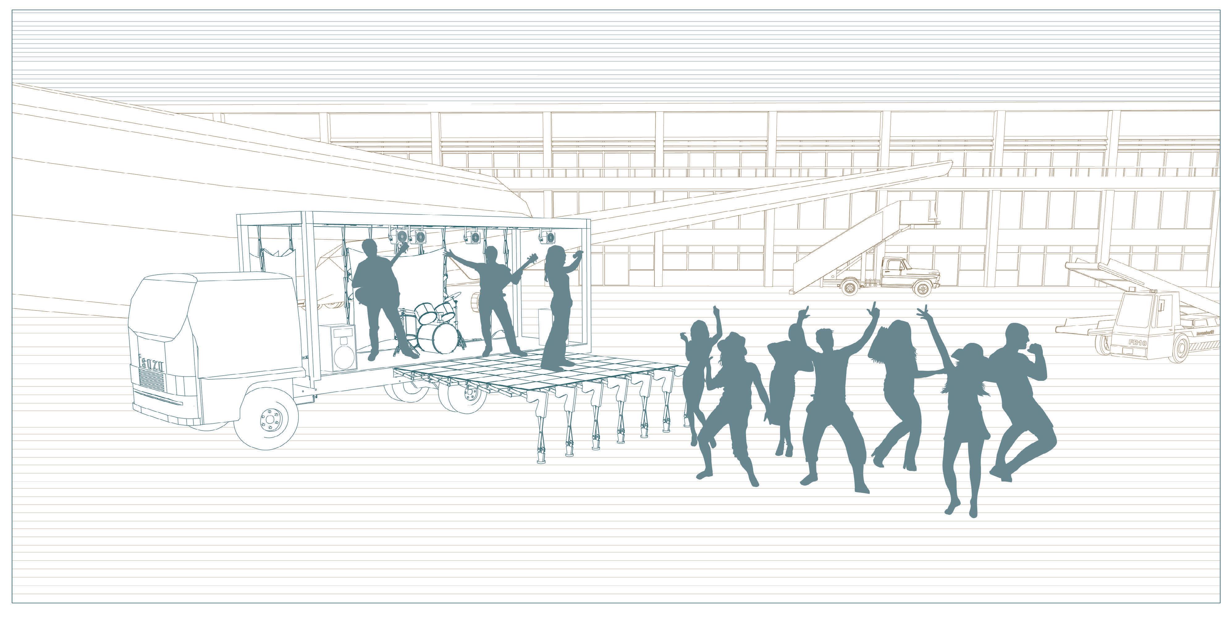 The stage structure is the most unique that uses the truck as part of the stage. The stage is functional only when every structure is unloaded from the truck. It is prefered to use the stage only for medium and large sized events. The stage is the only structure that due to the high electricity output both solar energy and energy from the truck batteries are used to provide sufficient power.