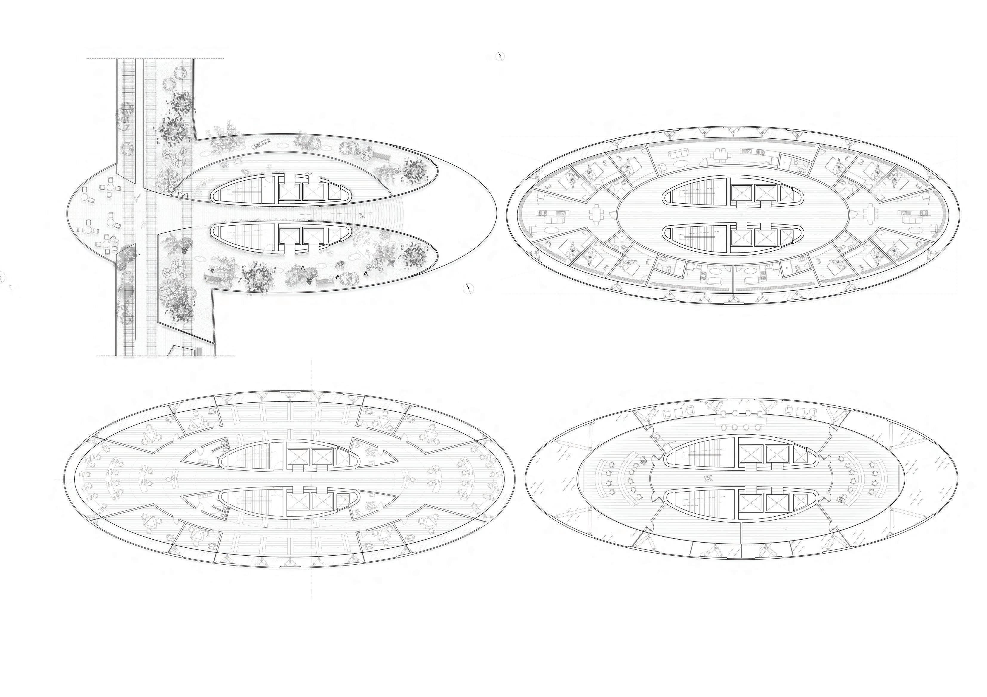 Top left : Highline public space. Top Right : Housing units. Bottom left : Library. Bottom Right : Seminar spaces.