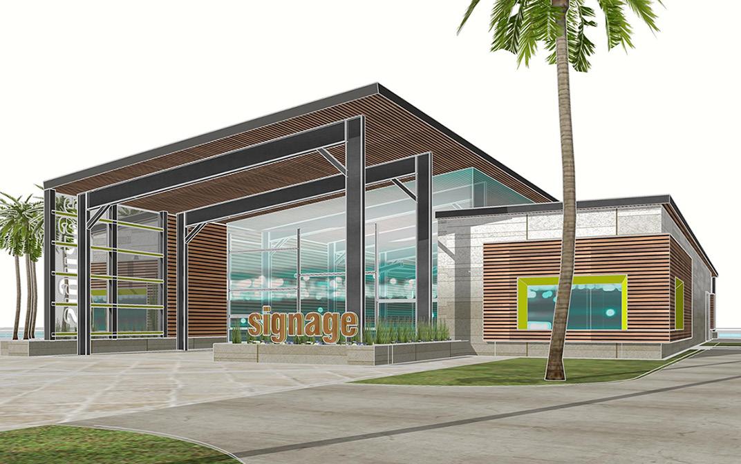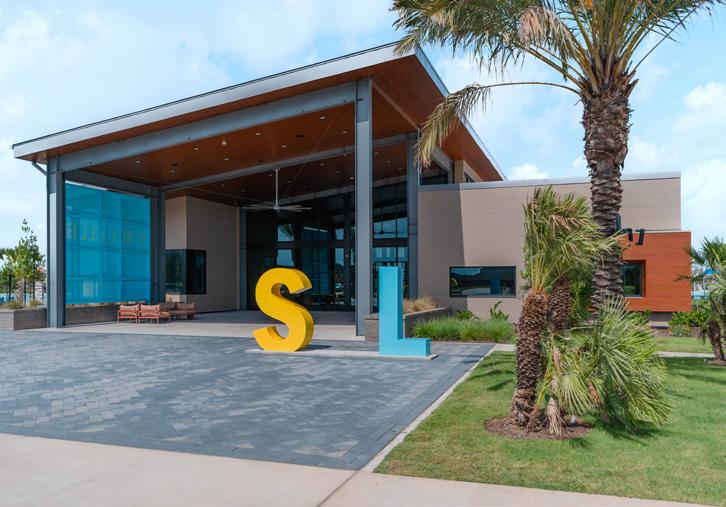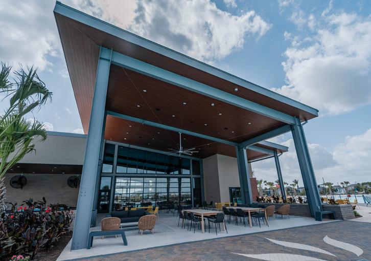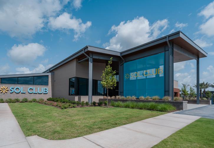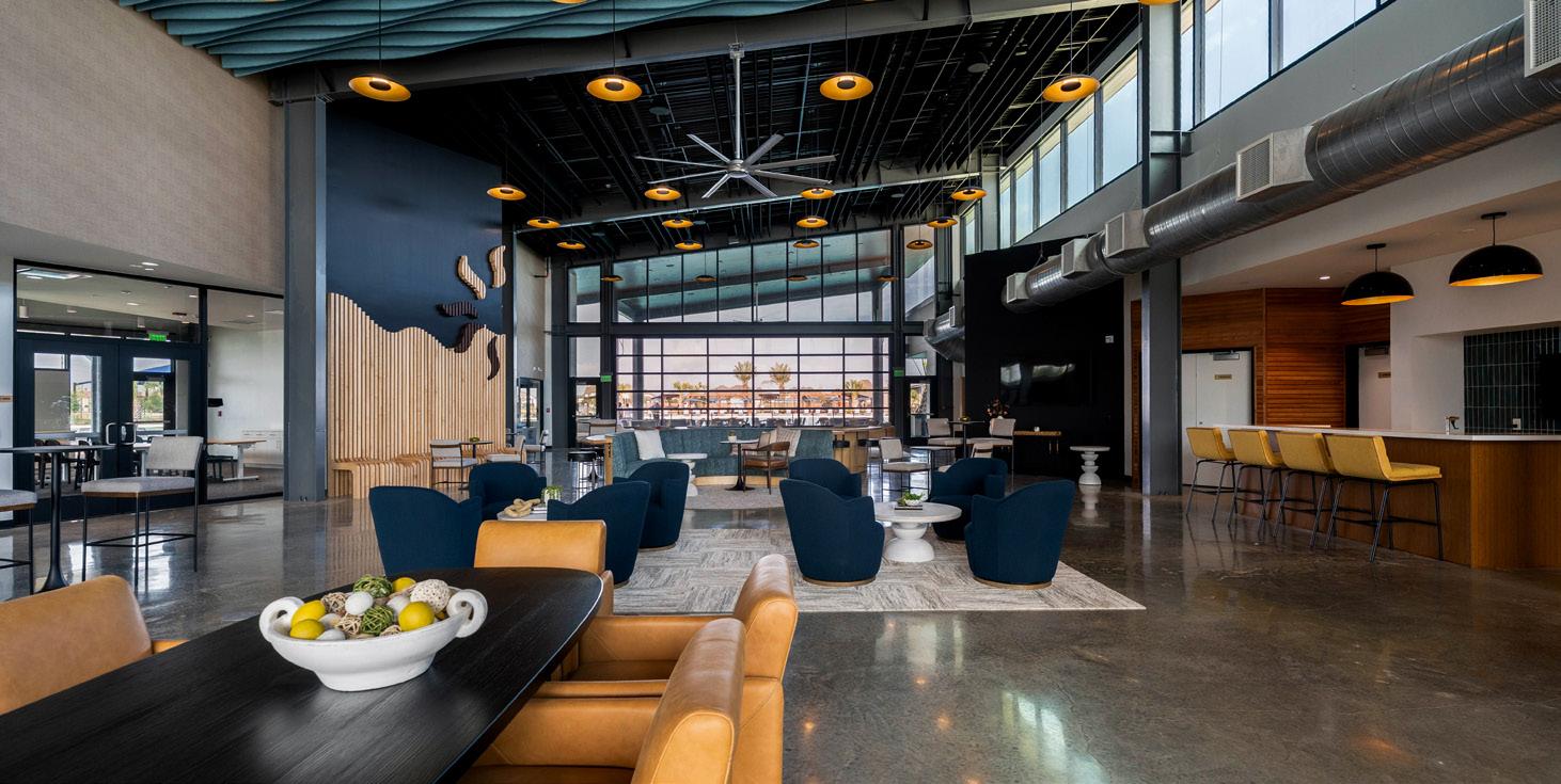 When we set out to design the interiors of the SOL Club, we knew it needed to honor its surroundings and the beautiful lagoon it was created to complement. The SOL Club was meant to embrace the sun — and much of that was achieved through fullheight glass along the exterior, clerestory windows, and a large overhead glass door that opens the building fully to the outdoors.