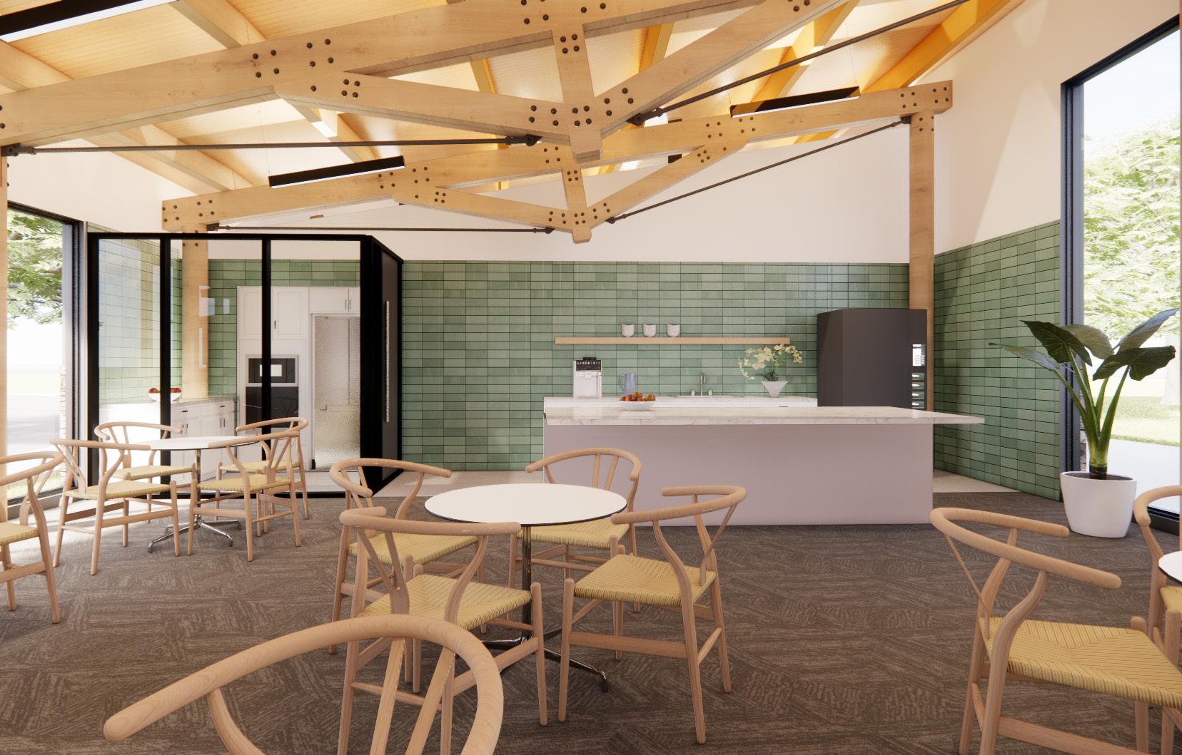 Top Above The Community room during construction allowed us to see the building in its purest form of heavy timber structure amongst the wood framing of the interior walls and attic. This gave the team the first glimpse at what the space would begin to feel like and the warmth the wood brings to the space.