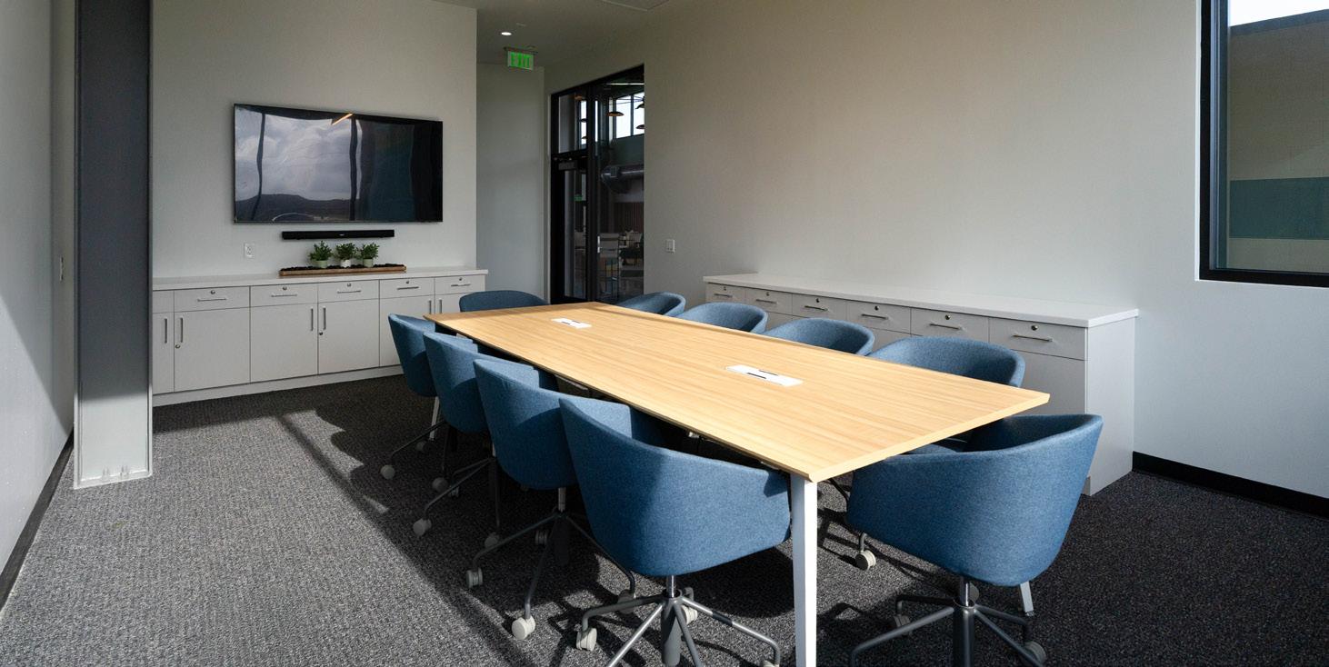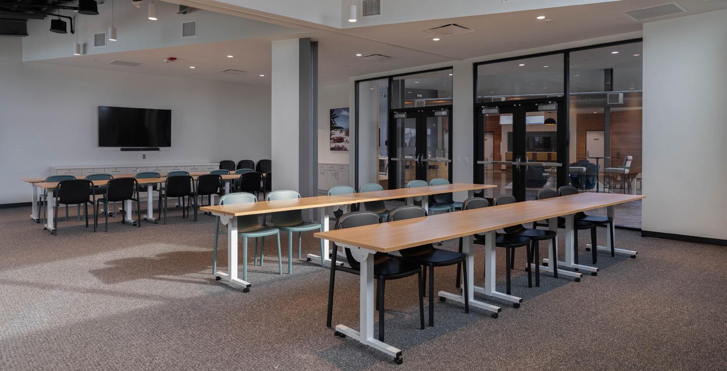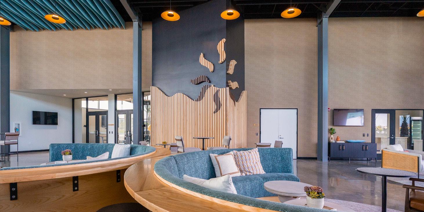 We also embraced the building’s industrial character, coordinating exposed mechanical and structural elements to be both functional and visually appealing rather than concealing them behind bulky chases or drop ceilings. To bring the outdoors in, we used abundant natural daylight, warm wood details, and a waveinspired acoustic ceiling treatment. A builtin feature of undulating wood panels forms a striking bench and signage moment — a sculptural focal point that captures the essence of the SOL Club.